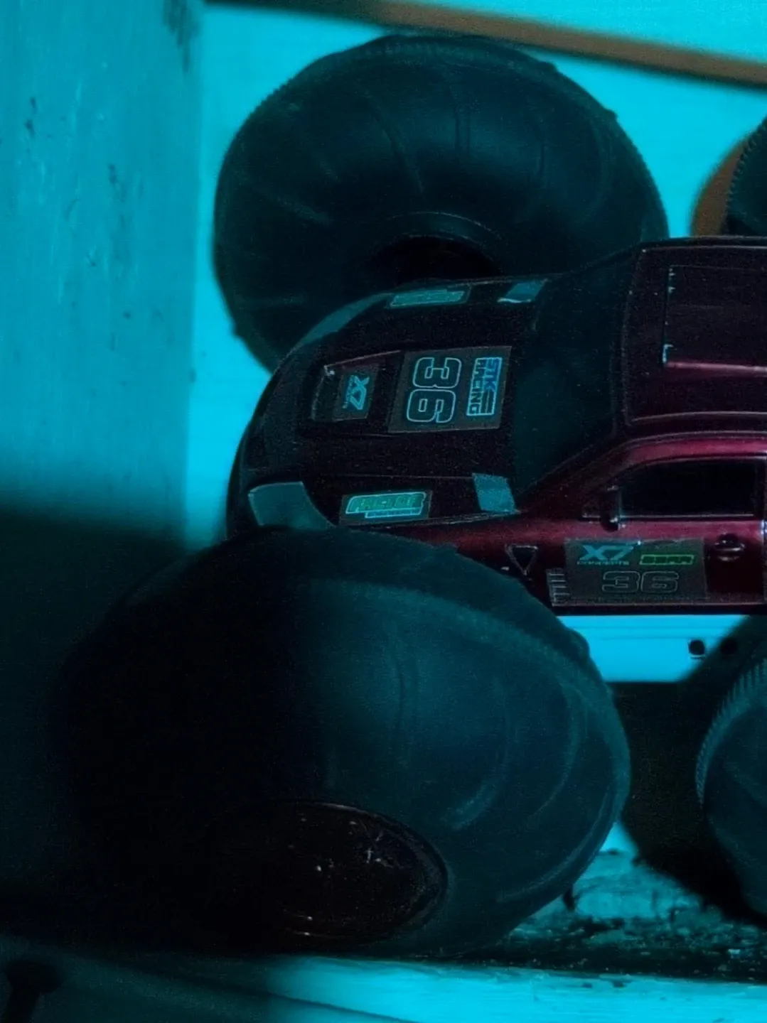 This is a red RC monster truck with oversized tires. It has 'X7 RACING' and the number '36' visible on the decals. The truck appears to be plastic with rubber tires.