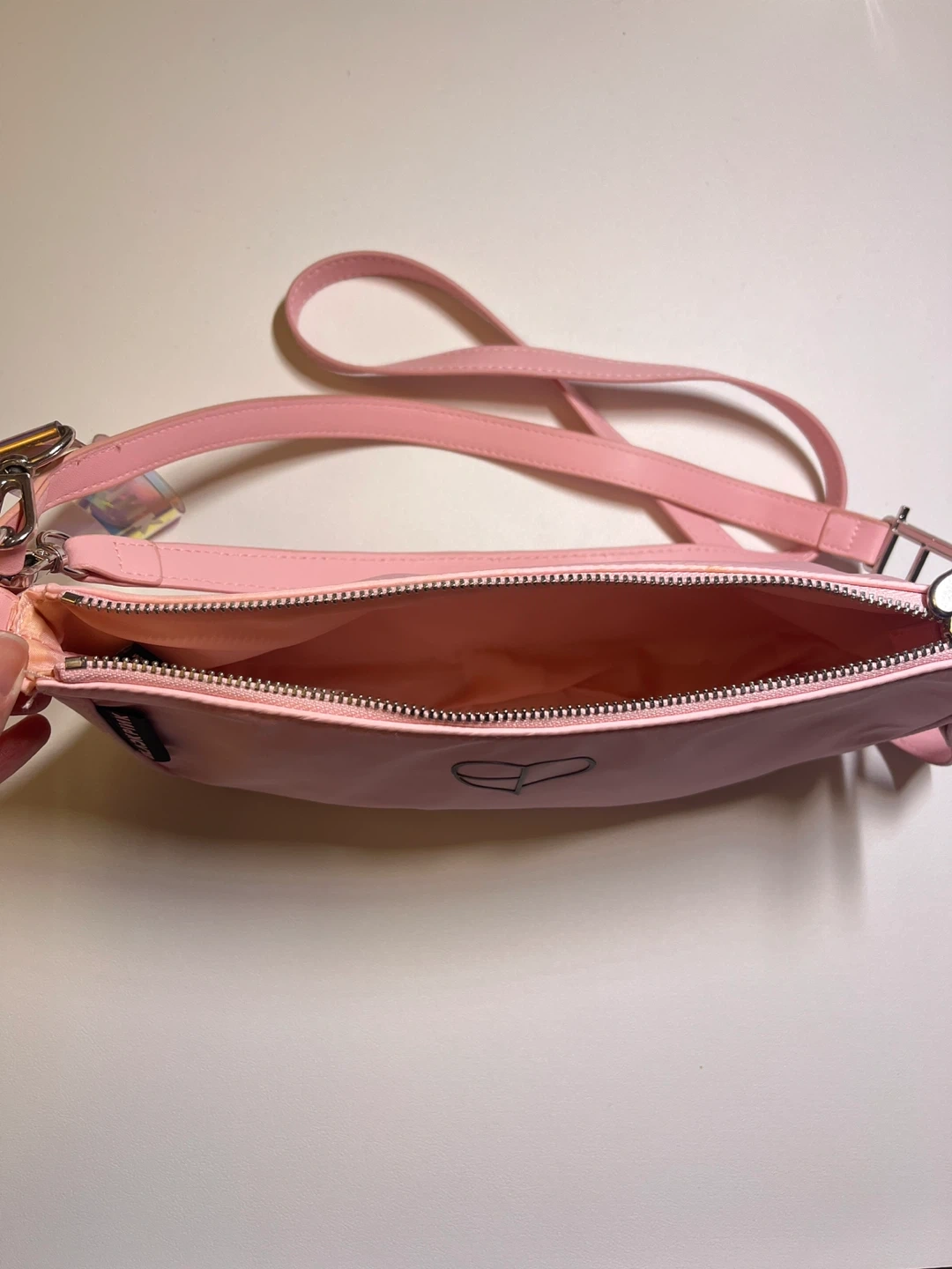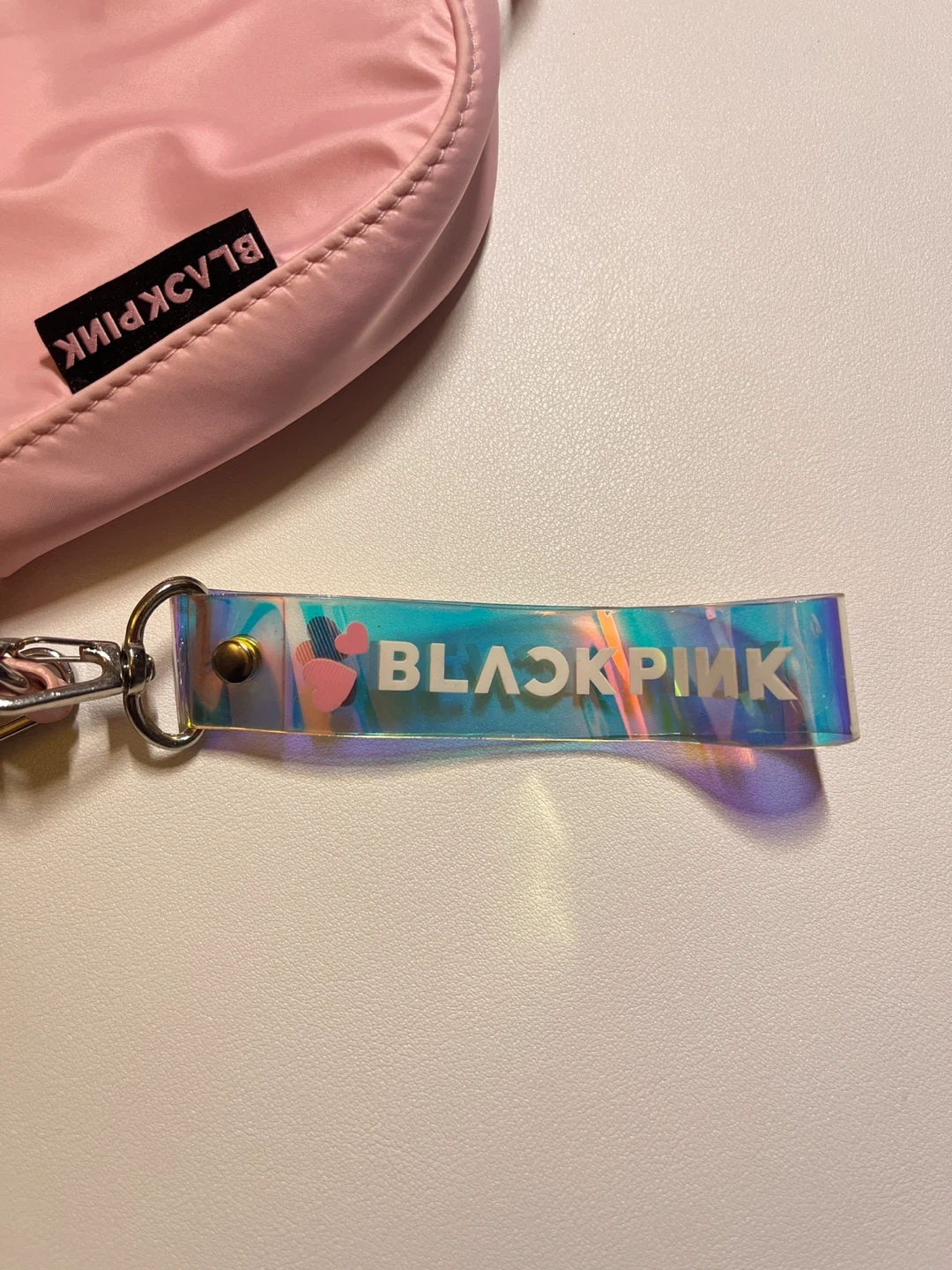 Pink shoulder bag with BLACKPINK branding. Features a zippered main compartment and 2 straps of different length.