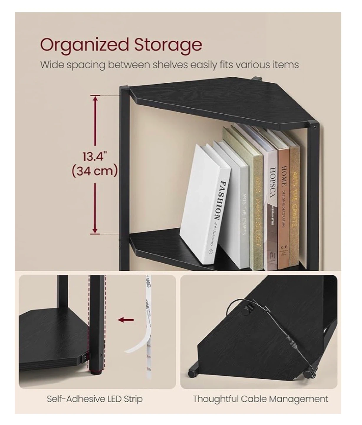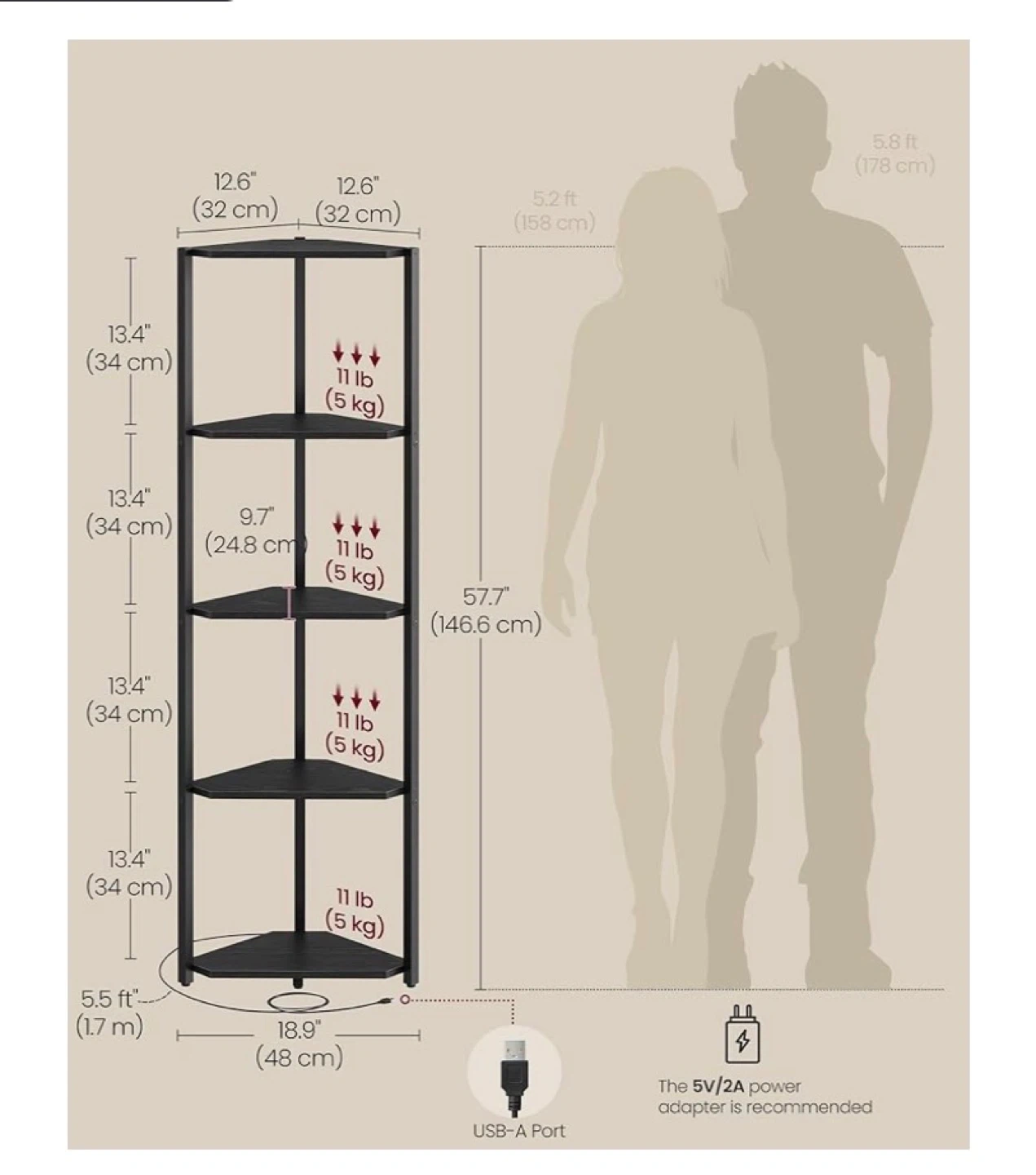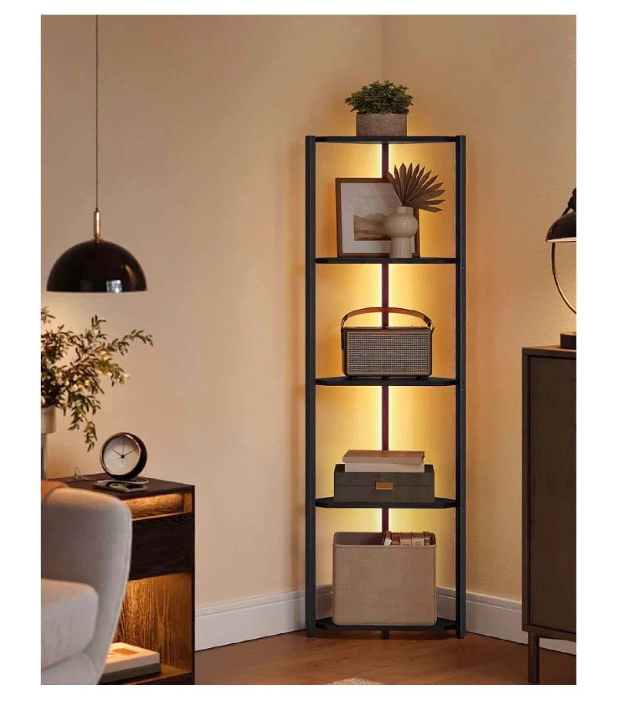 This black corner shelf unit is 57.7 inches tall with a 18.9-inch base. It features adjustable LED lights with 7 preset colours, 3 flashing modes, and 7 brightness levels. Each shelf supports up to 11 lbs (5 kg).