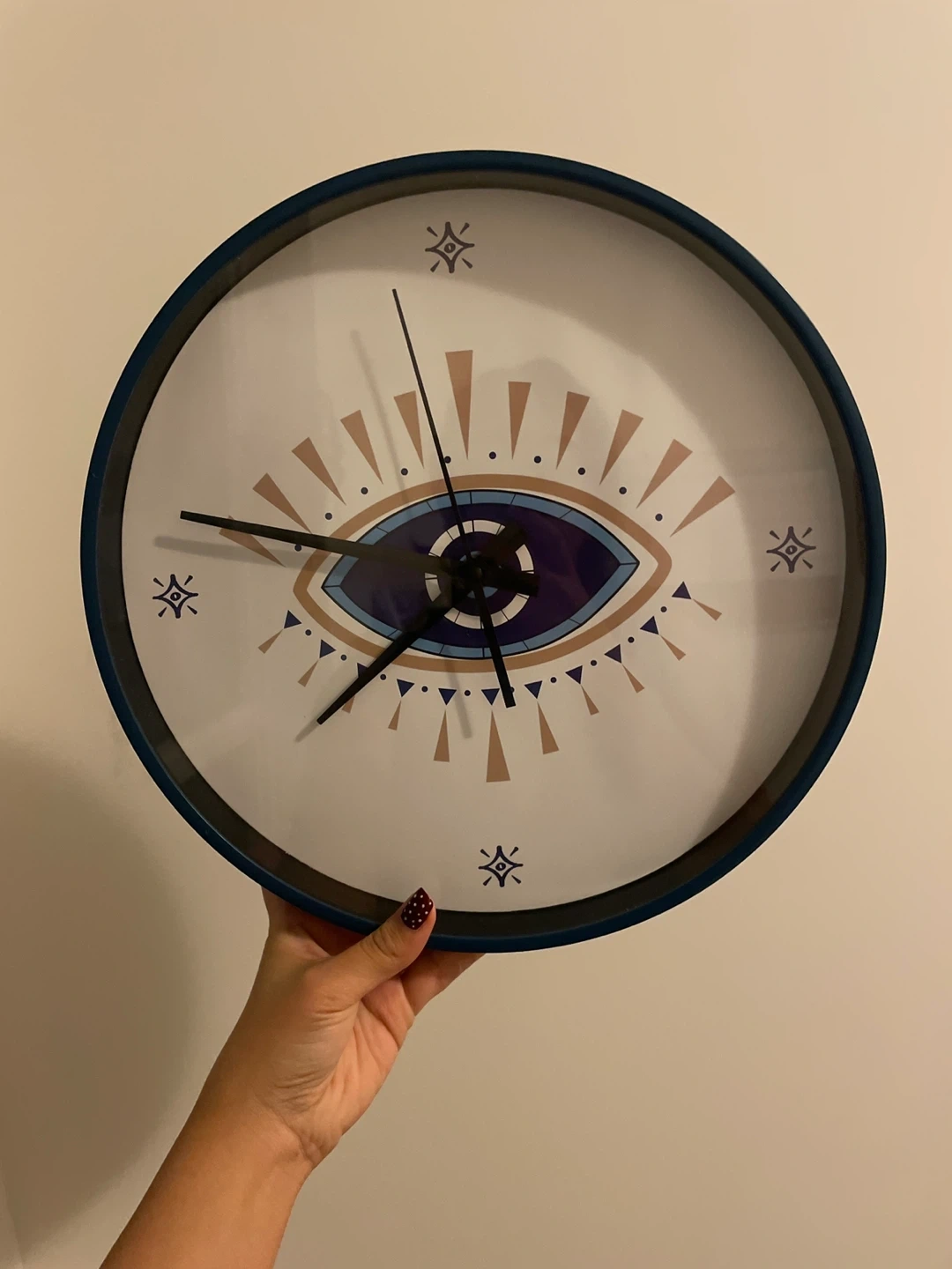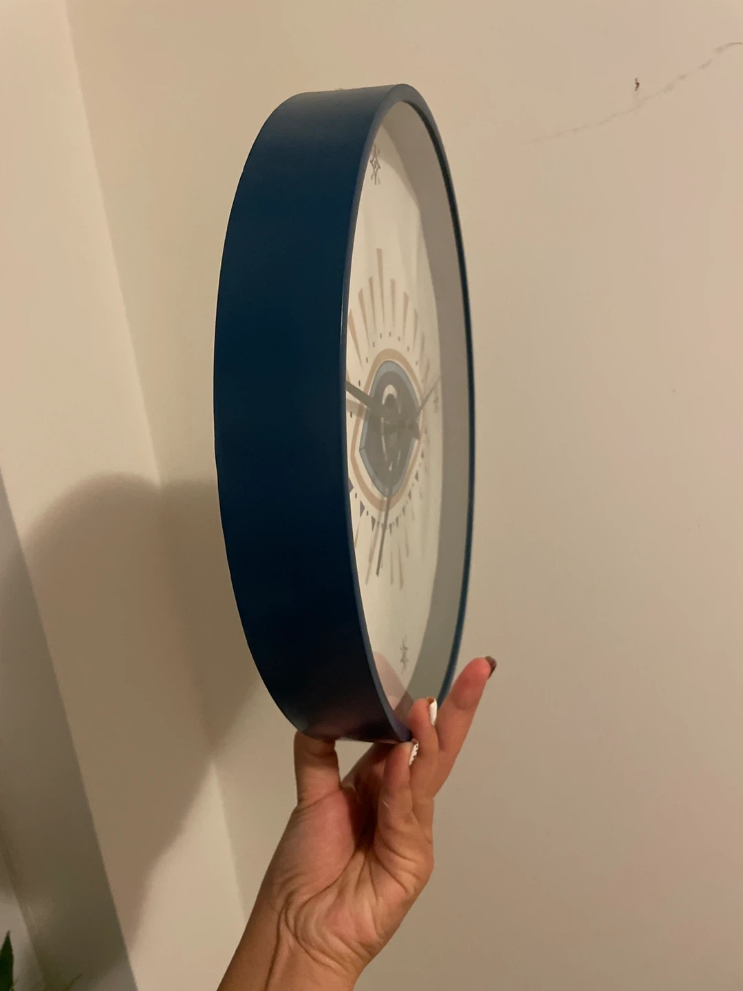 Selling a wall clock with a unique eye design! The clock features a blue accent around the rim and a distinctive eye graphic in the center. It requires one AA battery to operate, which is easily accessible from the back. Perfect for adding a touch of modern style to any room. It’s working perfectly fine.