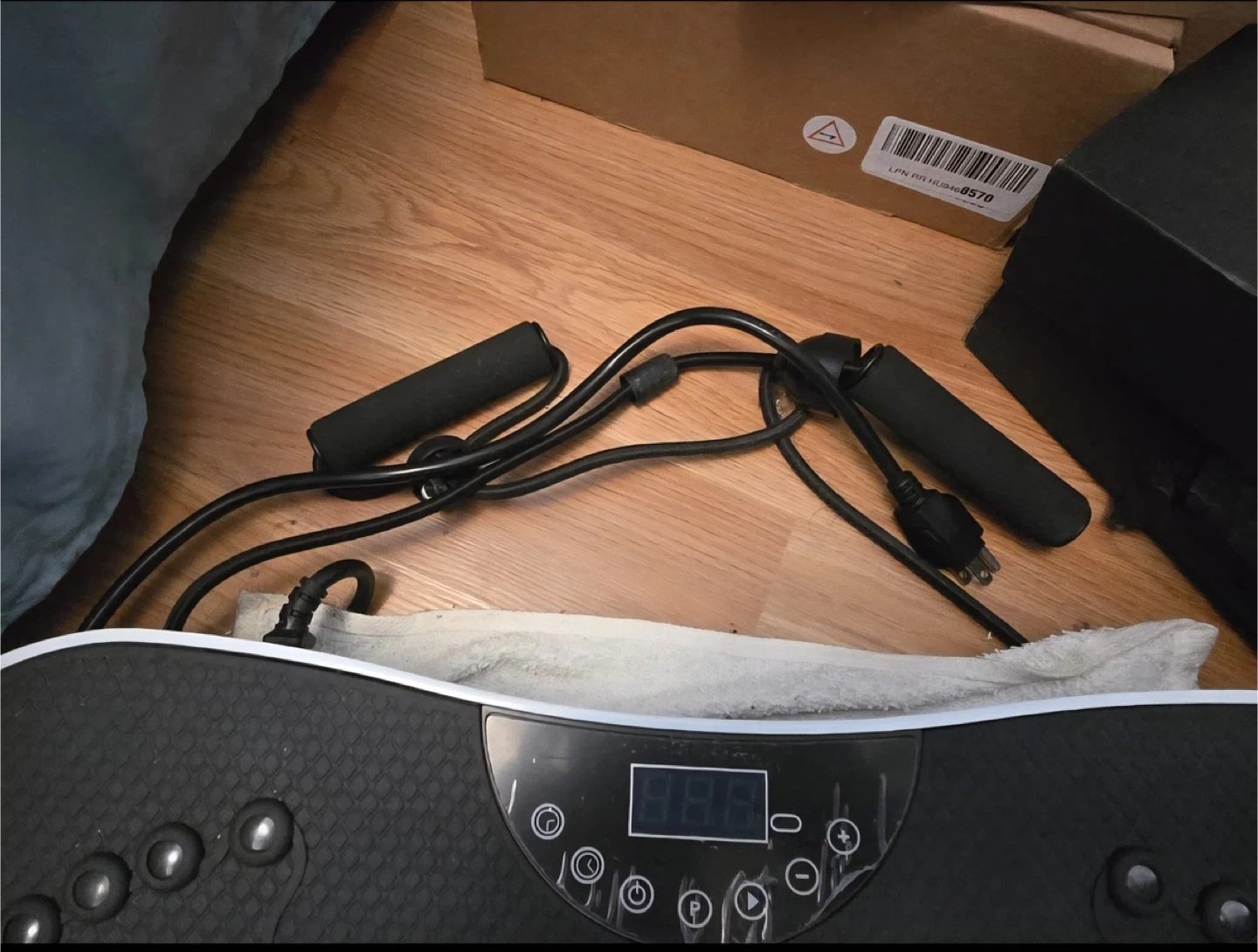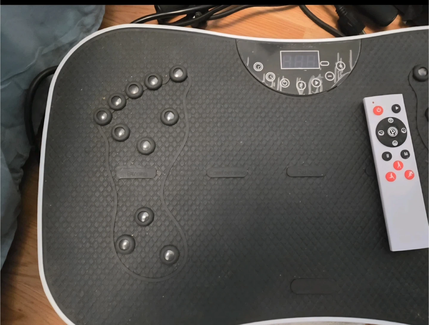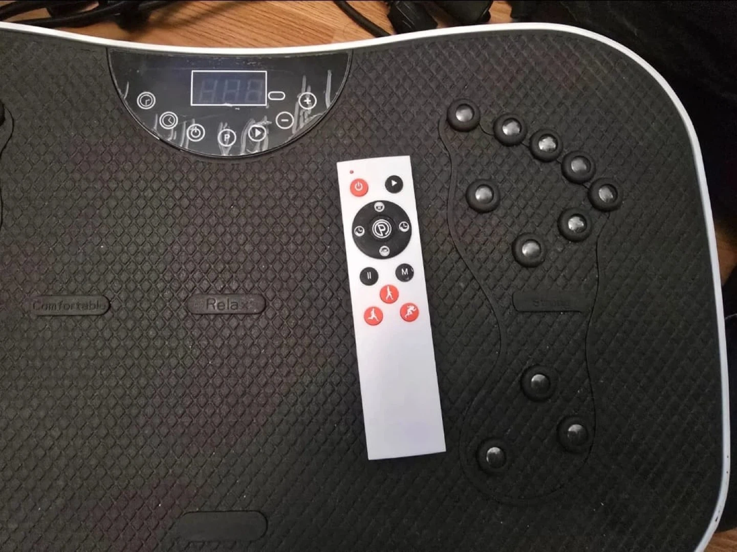 This is a vibration plate exercise machine. It comes with a remote control for easy operation and two resistance bands for added workouts. The machine features a digital display and multiple massage nodes on the surface for targeted foot massage.