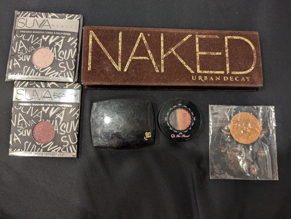 This bundle includes a variety of New or barely used eyeshadows. It contains 3 Suva Beauty Pressed Shadow Pans, a Naked Eyeshadow Palette from Urban Decay, a Too Faced Shadow duo in "beauty mark", and Color Design palette.