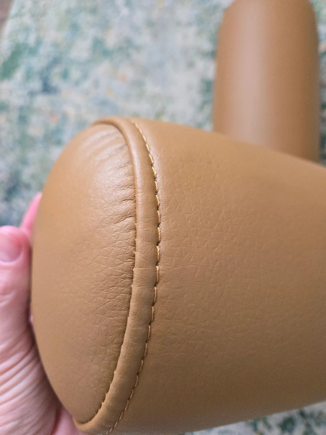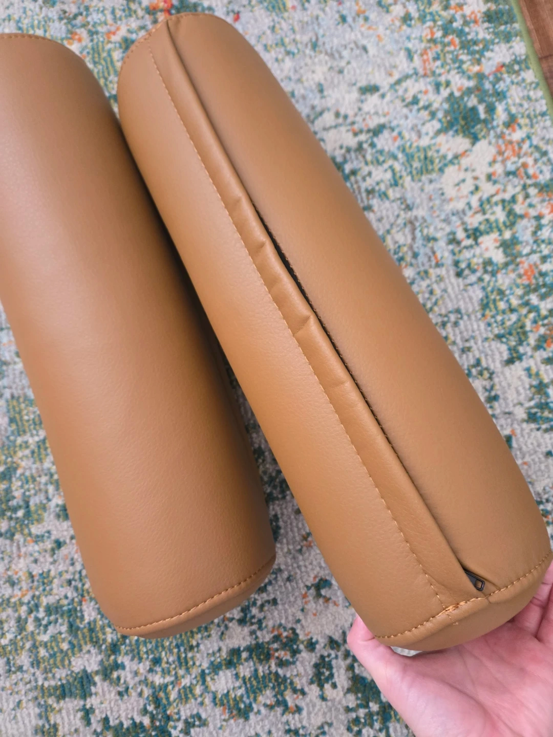A pair of brown faux leather bolster pillows. These cylindrical pillows are covered in a smooth, tan-coloured faux leather material with visible stitching. They're great for adding comfort and support.