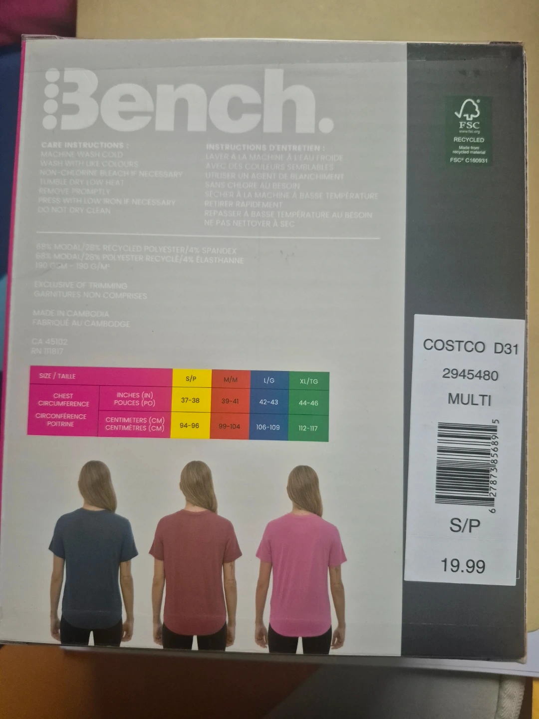 This pack includes three ladies comfort t-shirts from Bench. They are made with 89% modal, 9% recycled polyester, and 2% spandex. Machine wash cold. Available in size S/P.