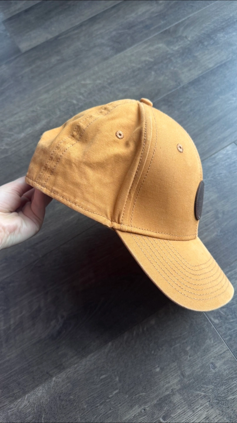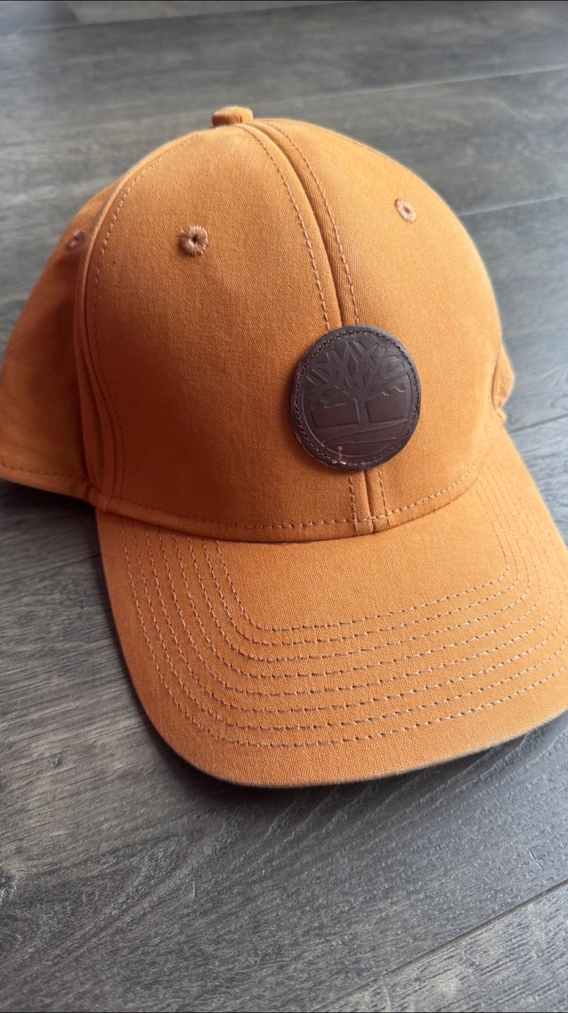Men's or unisex Timberland baseball cap. Mustard yellow colour. Features a brown leather logo patch. 100% cotton. One size fits most.
