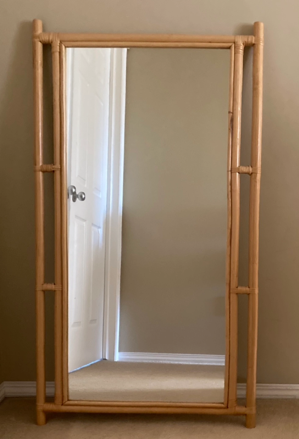 Vintage bamboo framed mirror with a rectangular shape. Has a glass front and is free-standing.