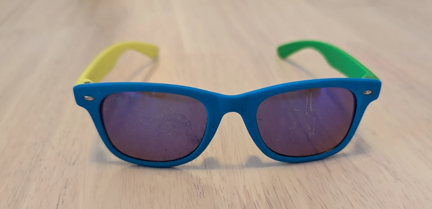 These kid-sized sunglasses have a blue frame with yellow and green arms. They offer a fun, colourful look for sunny days. Suitable for children who need eye protection from the sun.