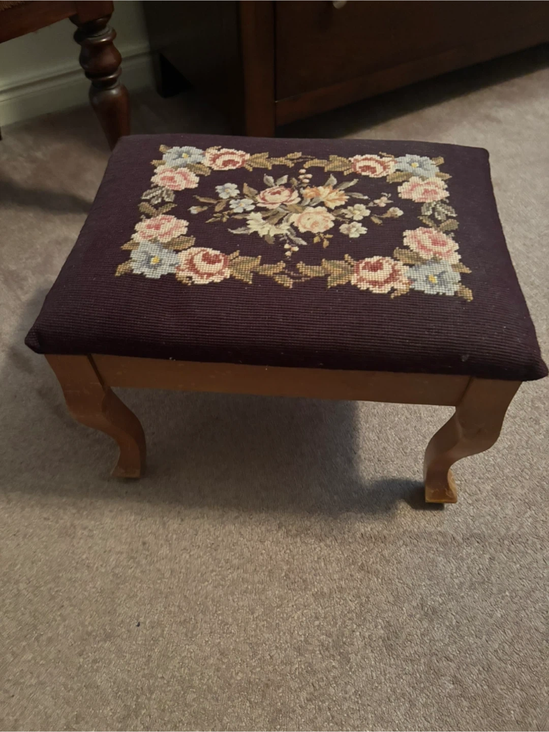 This footstool features a beautiful floral needlepoint design on a dark purple fabric. It has wooden legs with a curved design. It's a lovely addition to any room!