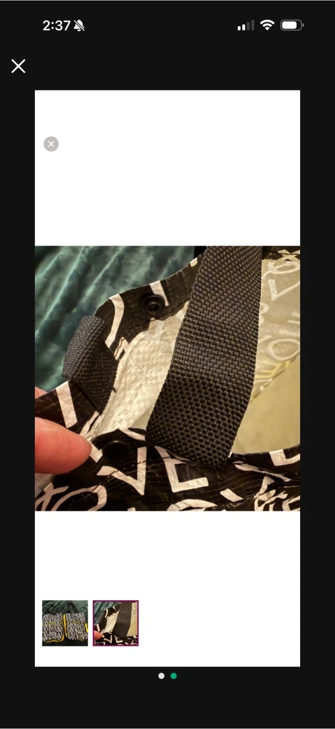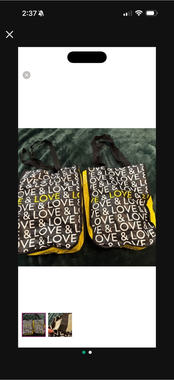 This set includes two reusable shopping bags with a repeating "Love & Love" pattern. They're made from a durable, wipeable material. Perfect for groceries or everyday errands!