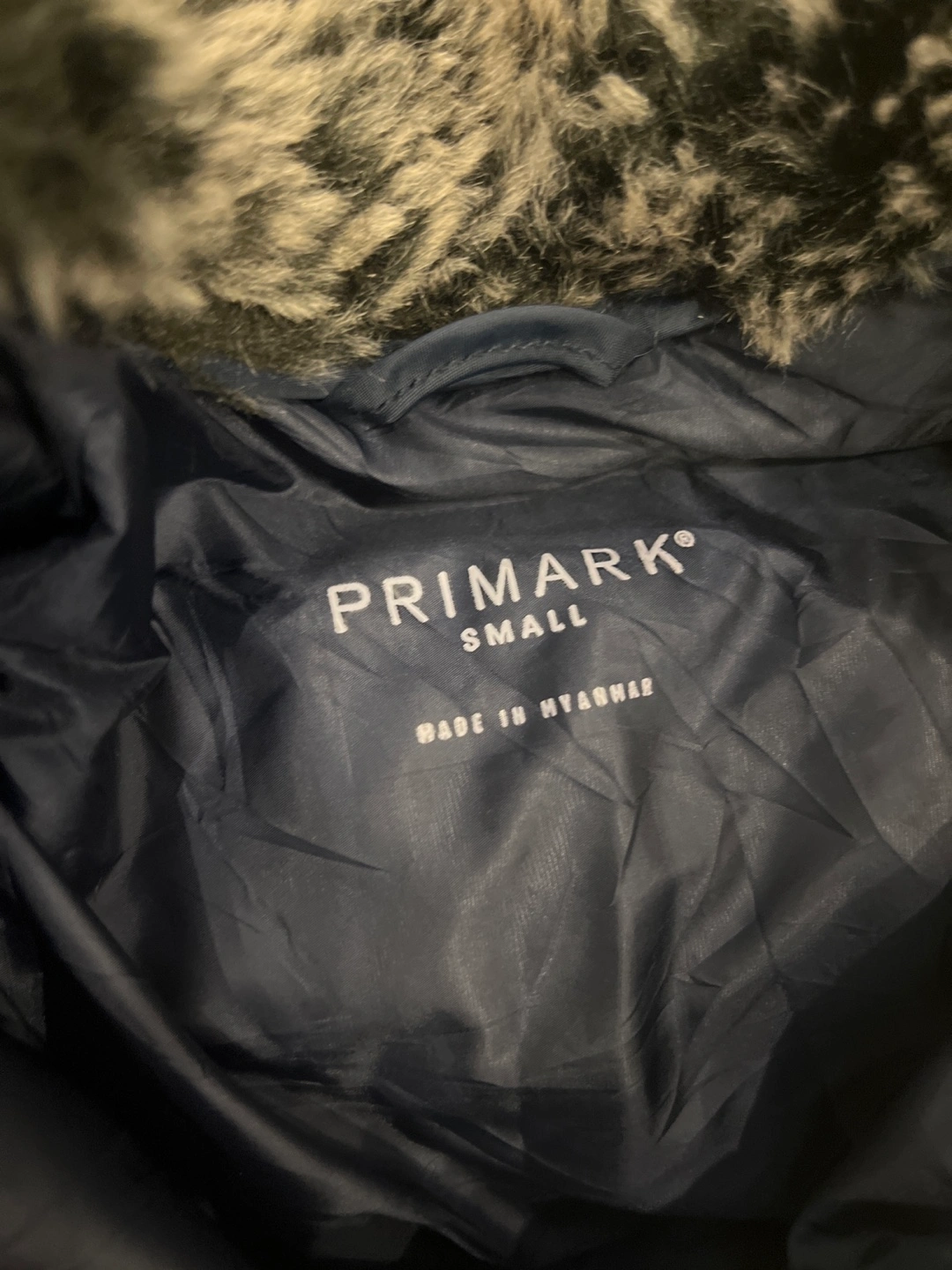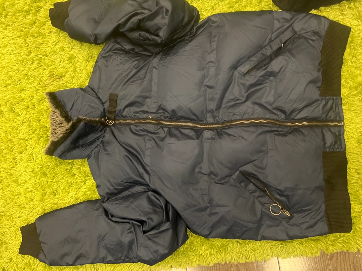 A comfy blue puffer jacket. Features a hood with a faux fur trim. A zipper closure. Ribbed cuffs and a ribbed hem. Perfect for a cozy evening out.