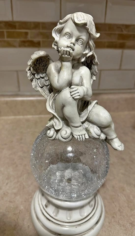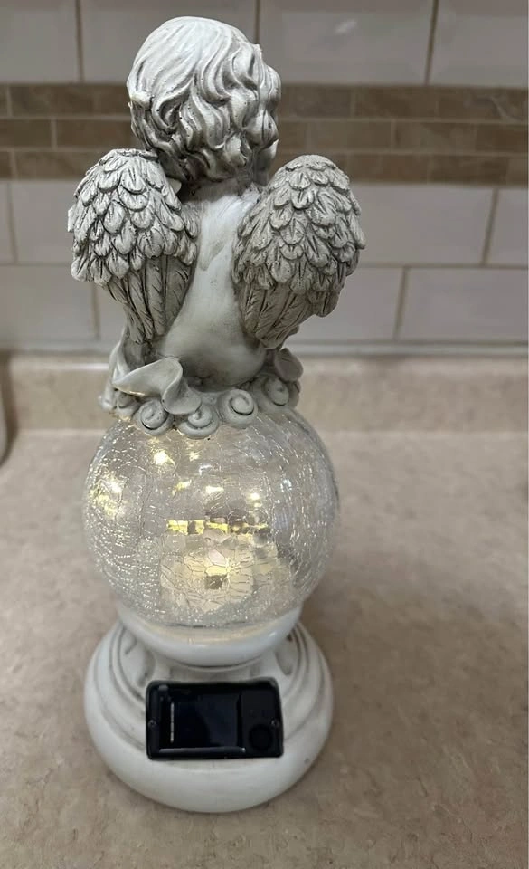 Cute cherub angel statue with a cracked glass effect globe that lights up. Solar powered, so no cords needed! Great for garden or patio decoration.