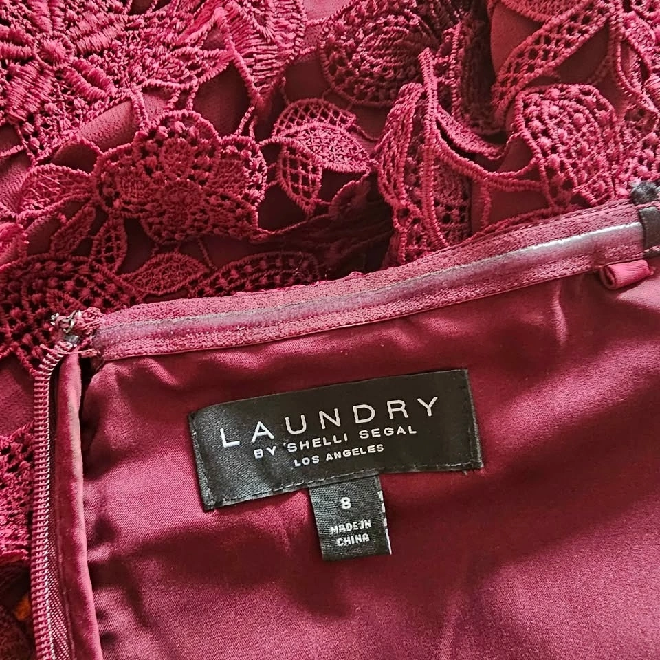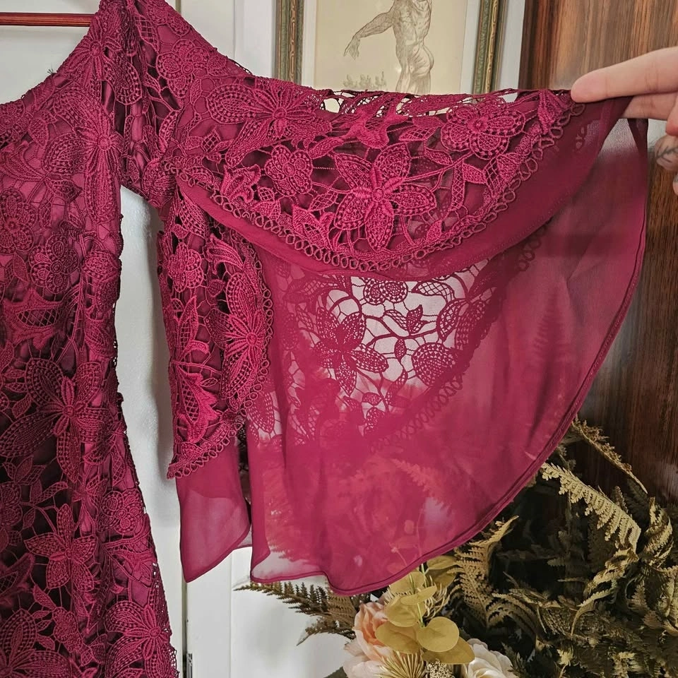 Beautiful lacy off-shoulder cocktail dress with dramatic tulip flutter sleeves from Laundry by Shelli Segal. The dress is a jewel tone wine/burgundy purple color.