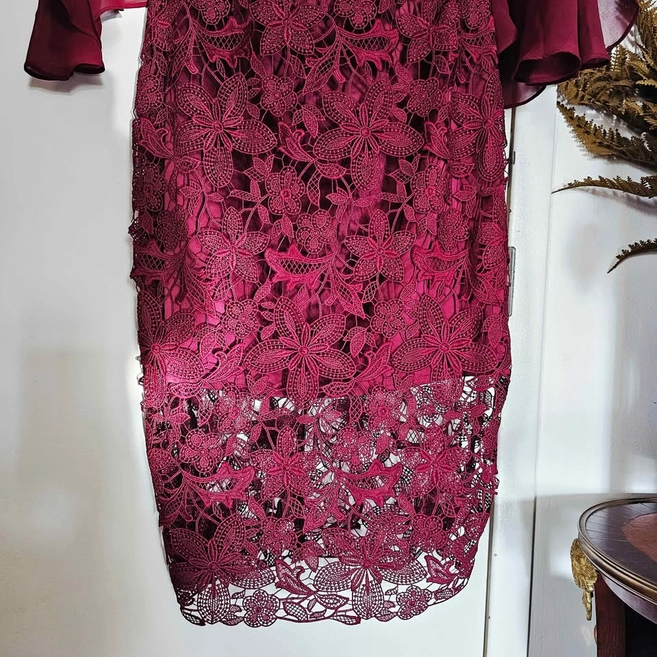 Size 8 Flutter Sleeve Lace Off-Shoulder Wine Cocktail Dress
