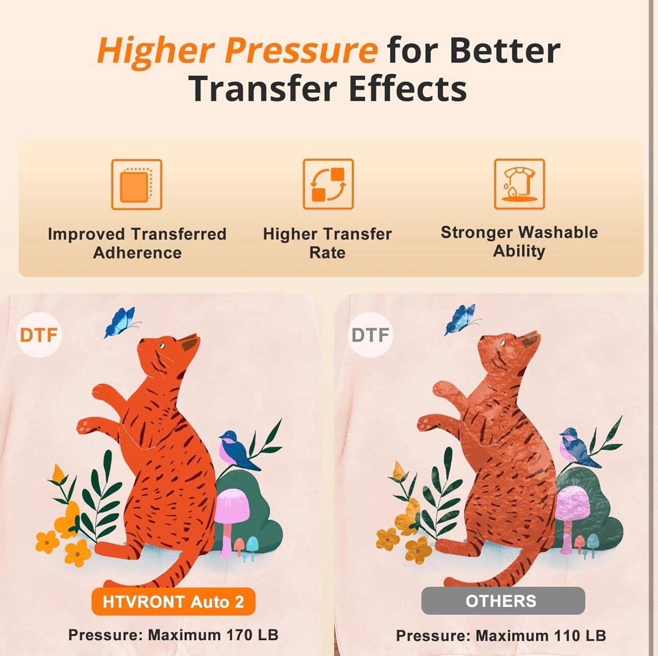 【Pressure Customization】HTVRONT Auto Heat Press 2 can effectively avoid the situation of insufficient pressure. You can adjust the appropriate pressure according to your different heat press needs, and easily adjust the pressure of the heat press machine up to 80 kg(170lb), perfect for DTF projects, no longer need to worry about insufficient pressure.