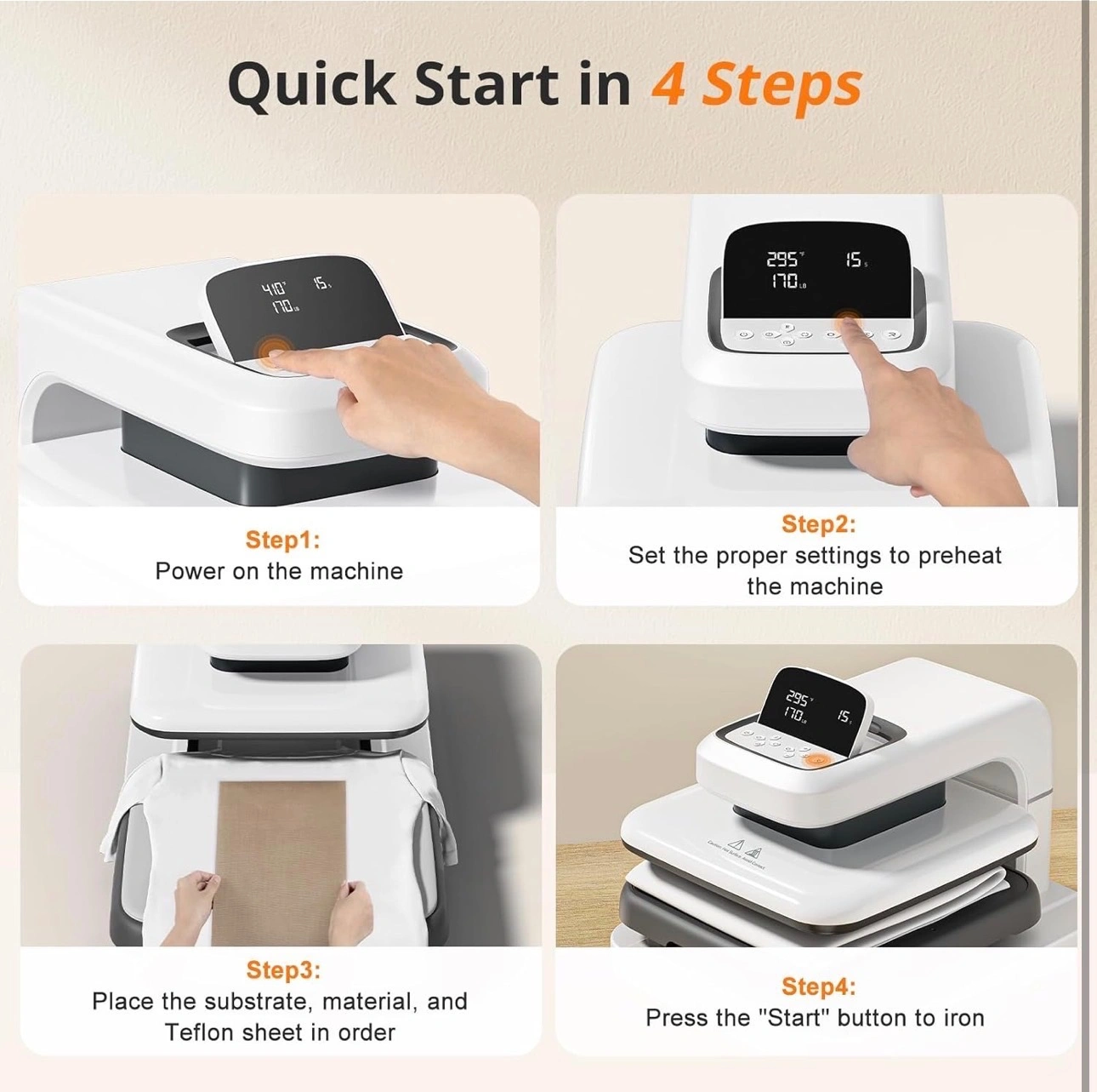 【Auto Press & Hands Free】After setting up the heat press parameters, you only need to press "R" button, HTVRONT heat press will automatically press your design, the machine will buzz when the timer is over to remind you that the press is finished and release the material automatically. In this way, you can work on something else while it’s pressing, greatly improving your work efficiency.