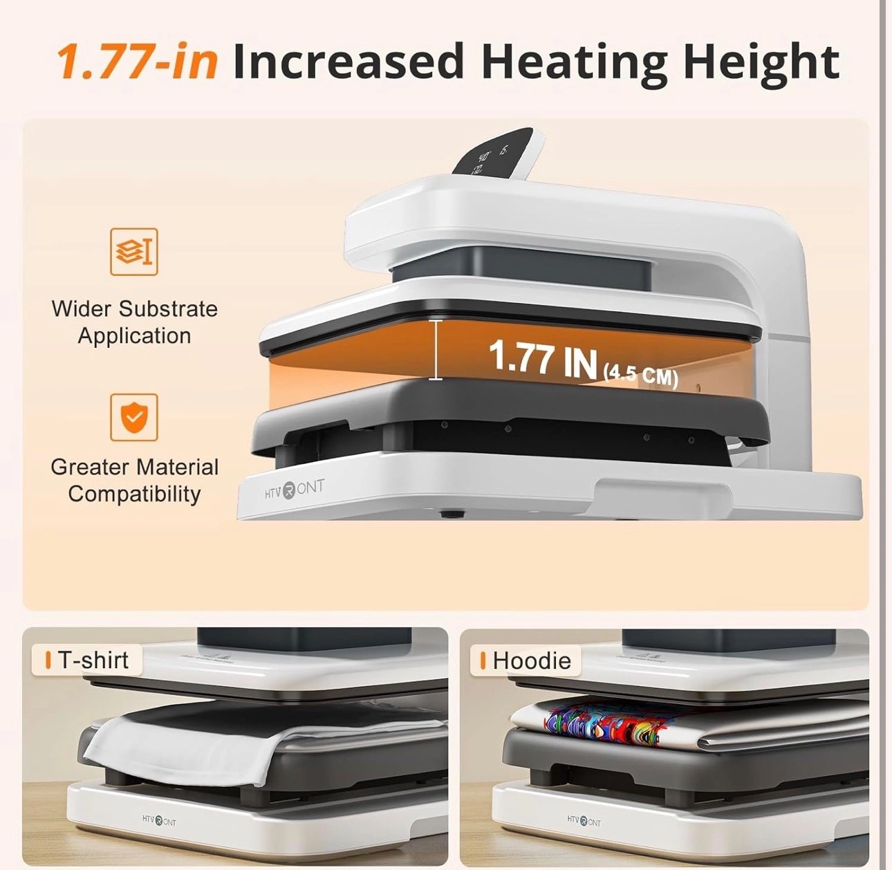 【Higher Heat Press Height & Widely Used】HTVRONT 15x15 heat press has increased the height for heat pressing. Now, you're ready to go with larger, more varied projects with heights up to 4.5 cm(1.77in). This will mean that you can use our heat press machines not just for heat pressing shirts and simple heat pressing projects, but you can also use it for heat press heavy items such as your hoodies!