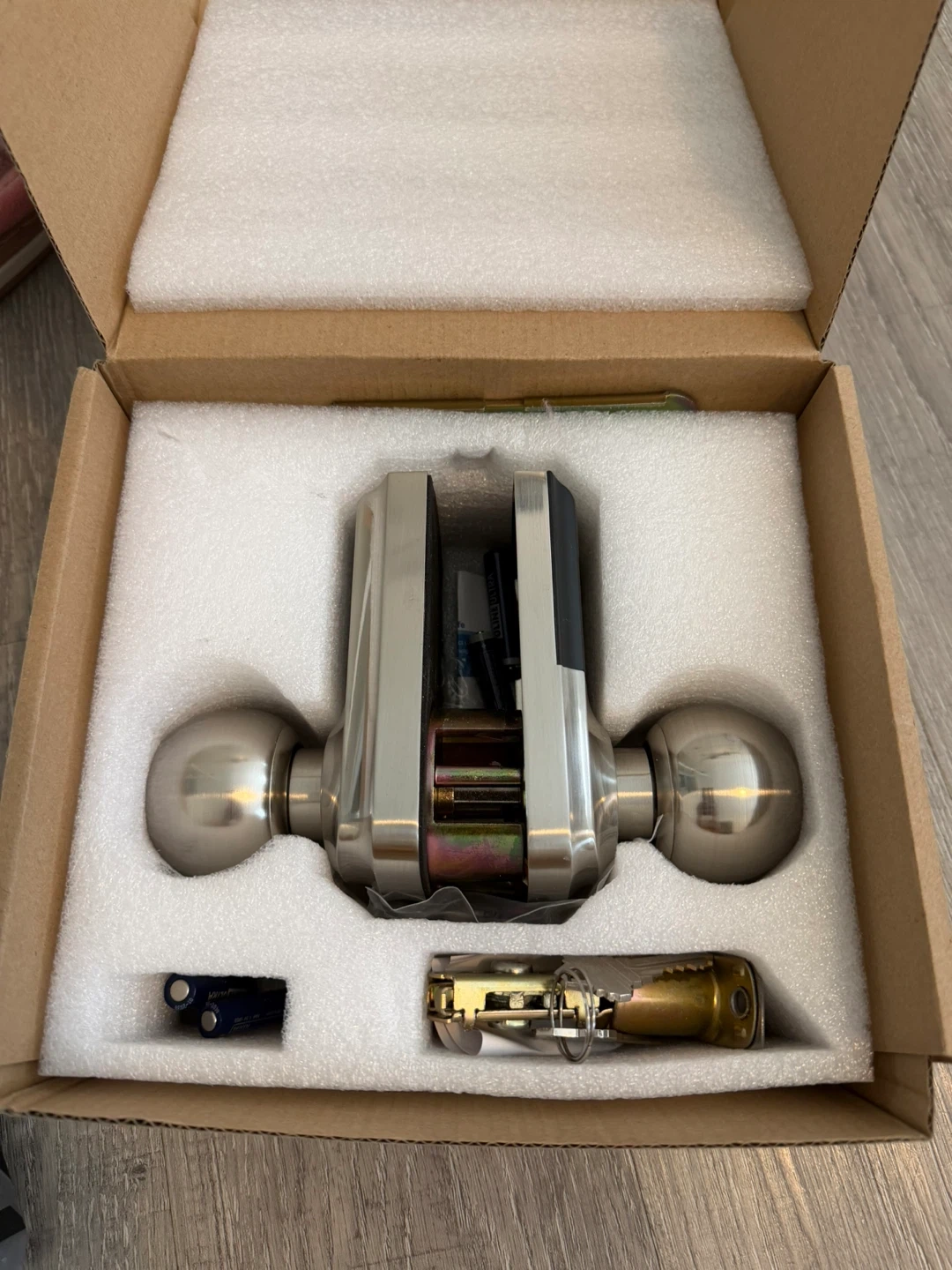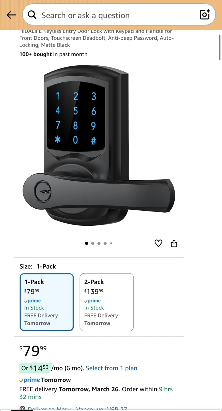 This is a HIDALIFE keyless entry door lock with keypad and handle. It features touchscreen password entry and auto-locking. Comes in matte black. Includes original packaging.