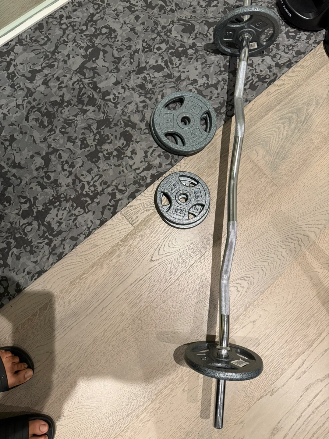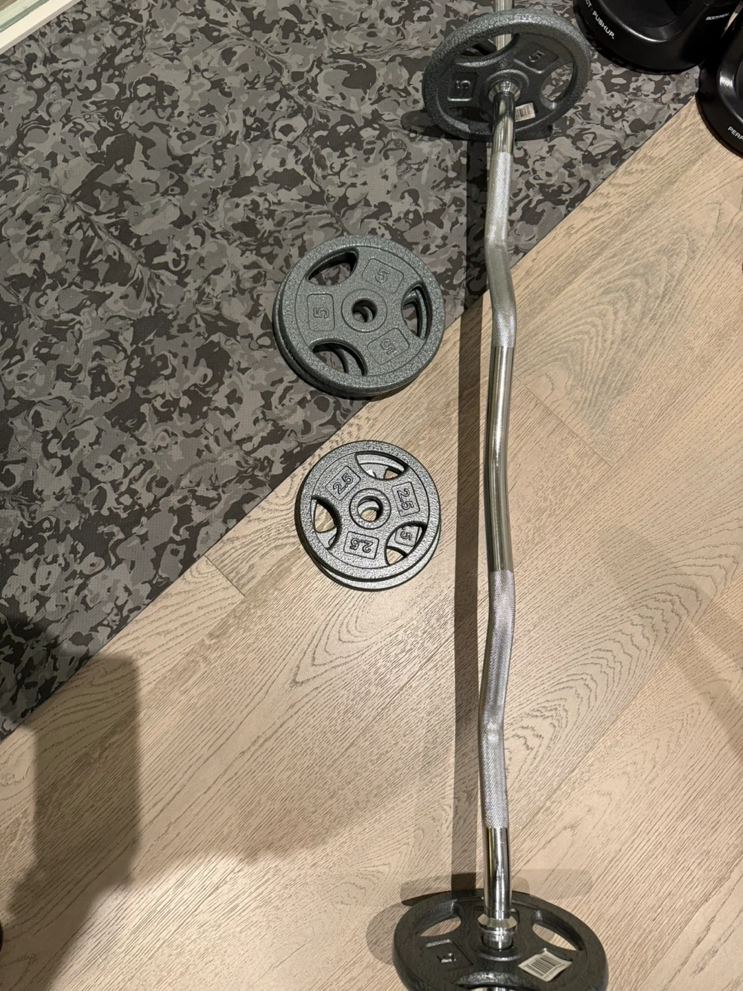 Selling an EZ curl bar with weight plates. The plates are 2.5 lbs and 5 lbs each. Great for your home gym!