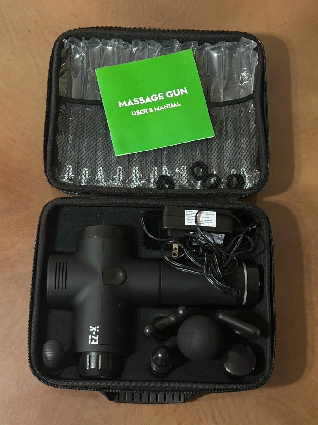 Looking to sell my EZ-X massage gun. It comes with its original case and all the attachments you see pictured. It also includes the user's manual and charger. Great for relieving muscle tension after a workout or a long day!