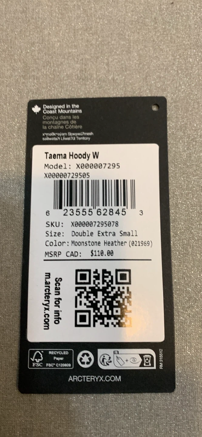 This is an Arc'teryx Taema Hoody W. It's a Double Extra Small size. The colour is Moonstone Heather. It has a hood.