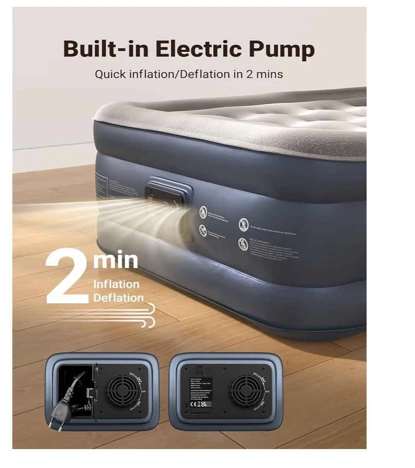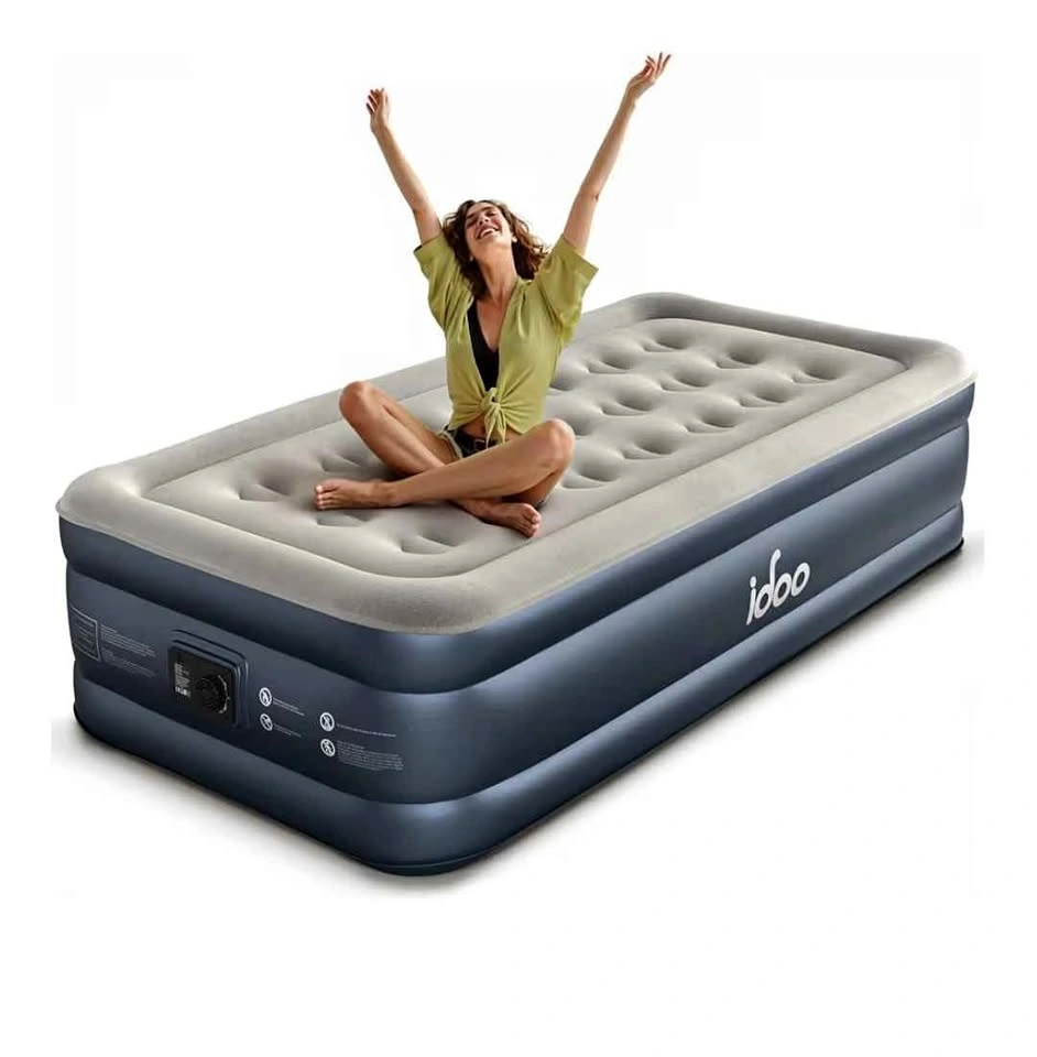 Convenient idoo air mattress with a built-in electric pump for quick inflation and deflation in just 2 minutes. Super portable and lightweight, easy to roll up and carry with the included bag. Great for guests or camping trips.