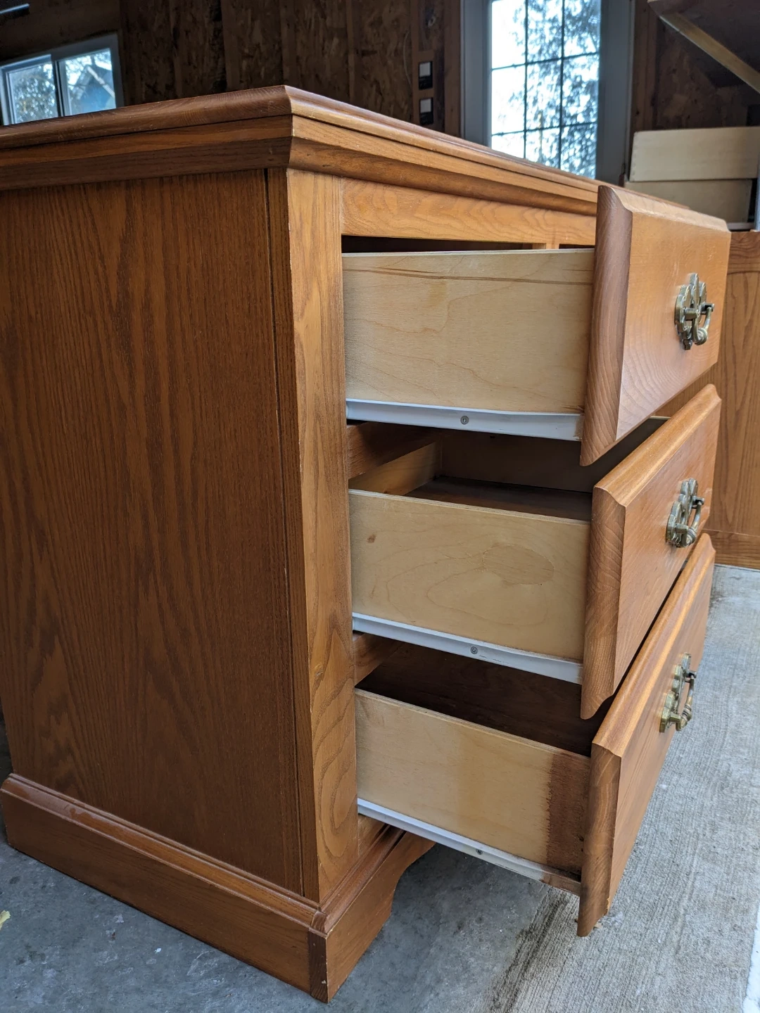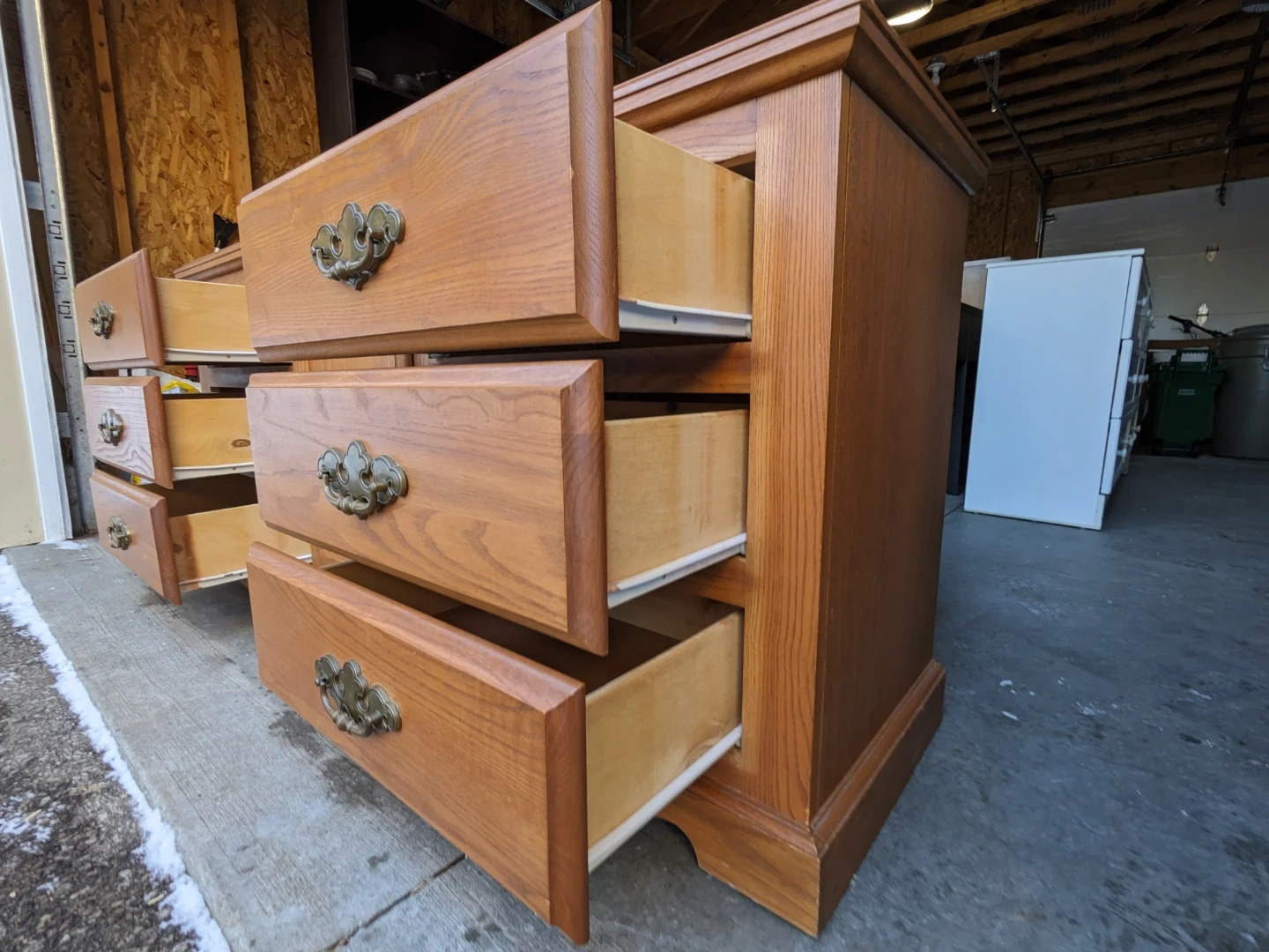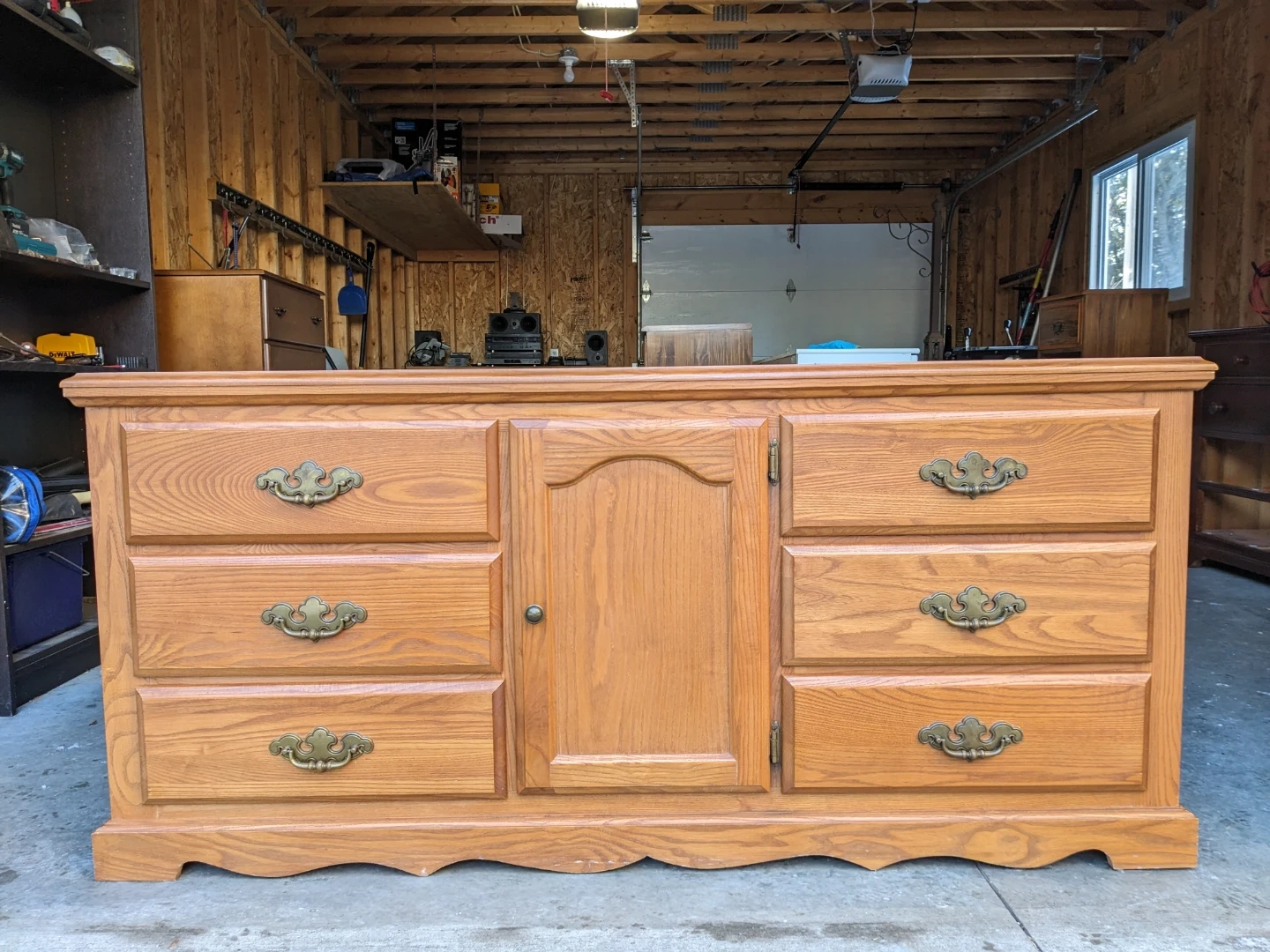 This 6 drawer/cabinet combo in solid oak features spacious drawers as well as a cabinet with 2 shelves for additional storage. The drawers all work perfectly on their metal slides with security stops and are in excellent condition inside. This is a solid and sturdy premium oak piece that is built to last. The durable antique bronze pulls as well the scalloped edging of the base give this dresser a traditional charm.