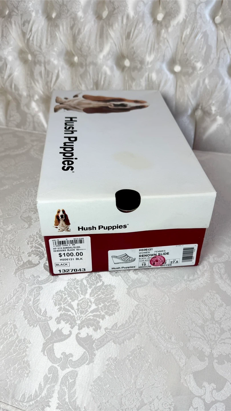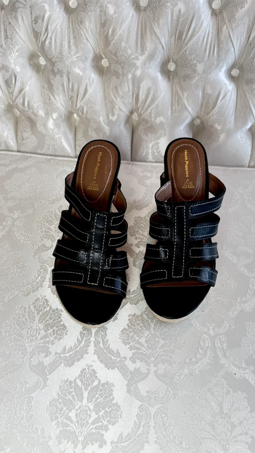 These are Hush Puppies black wedge slide sandals. They're made with a black authentic leather upper and a cork wedge heel. Includes the original box. Never worn.
