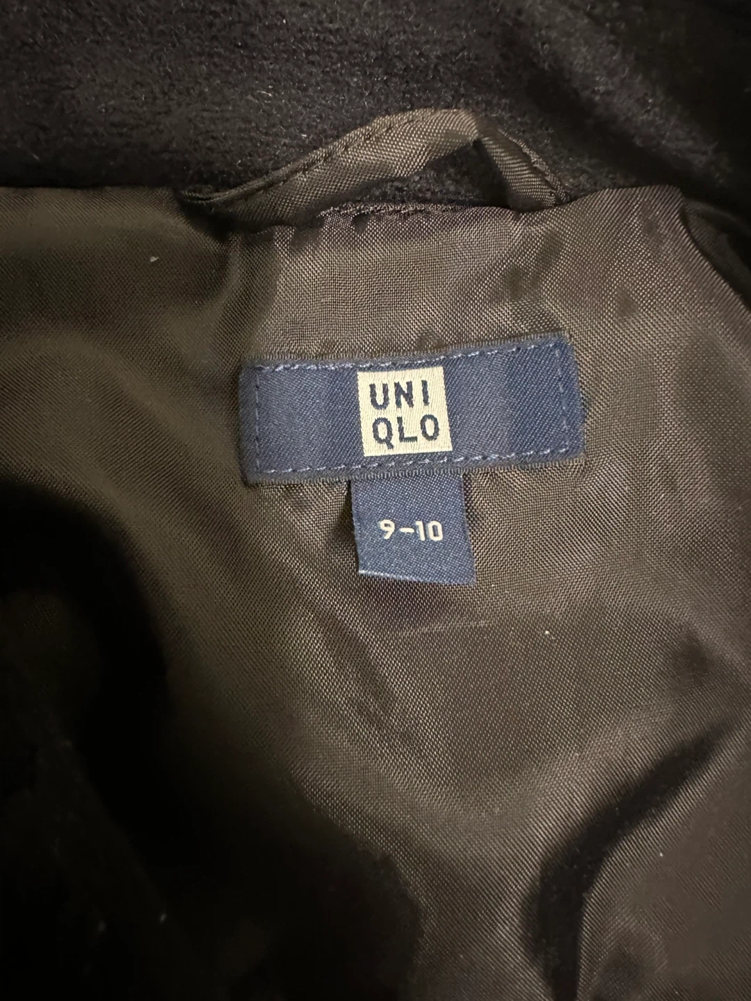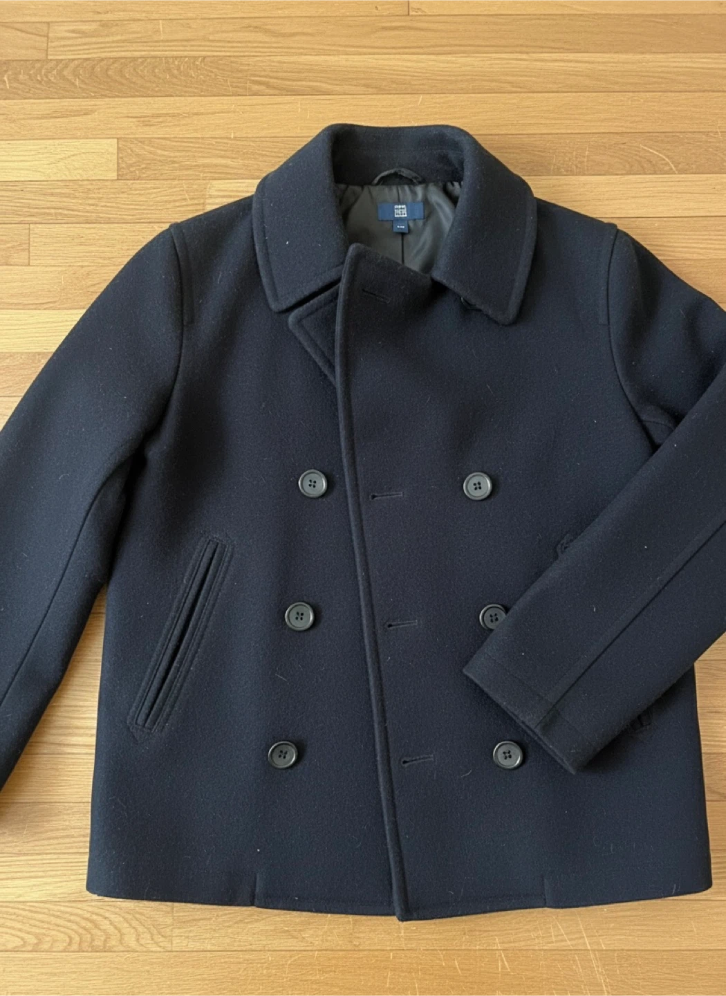 UNIQLO boys' navy pea coat with double-breasted button closure. Size 9-10. Only wore a few times, first image is the actual jacket.