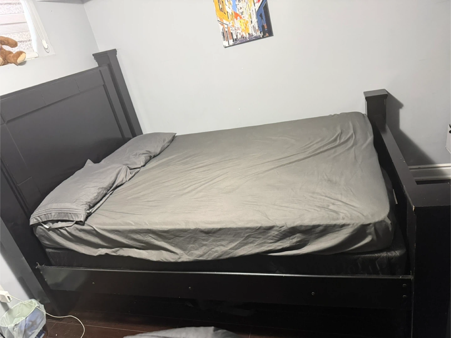 This is a black wooden bed frame. It has a modern design with a sturdy build. This frame is suitable for a queen-sized mattress.