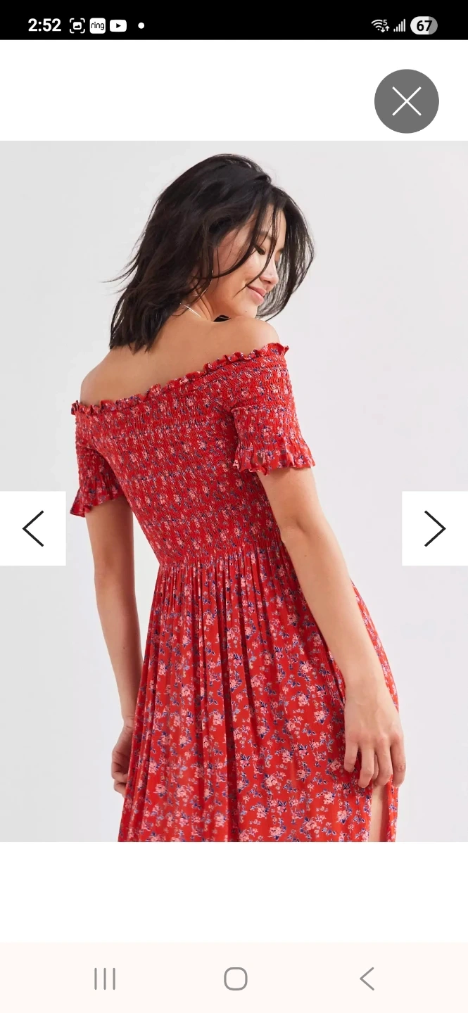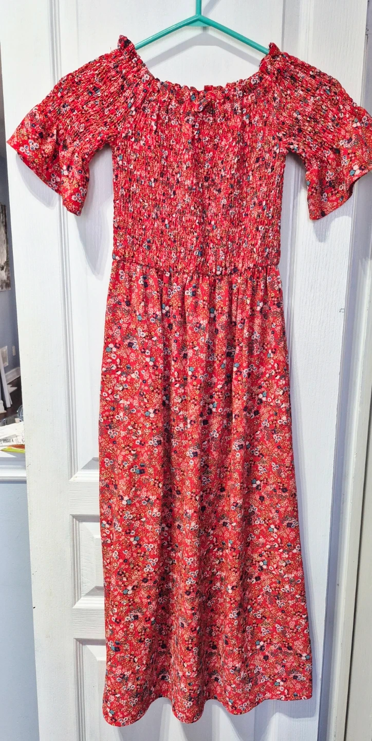 This red floral midi dress features a smocked bodice and off-the-shoulder neckline. It has short flutter sleeves and a flowy A-line skirt. It's a lovely piece for warmer weather!