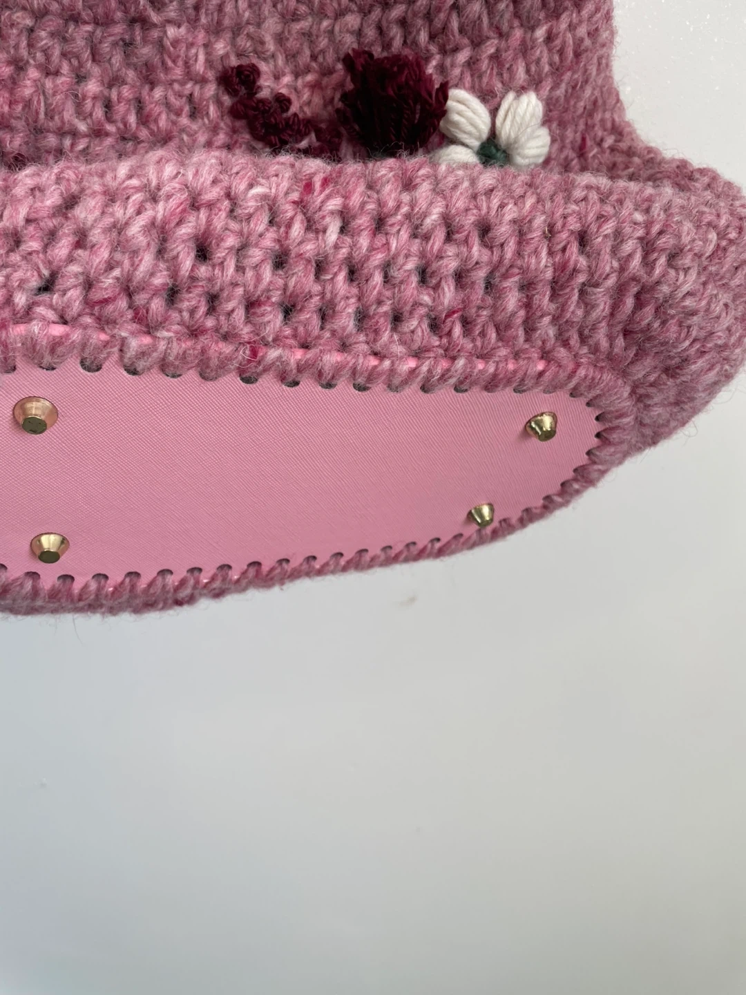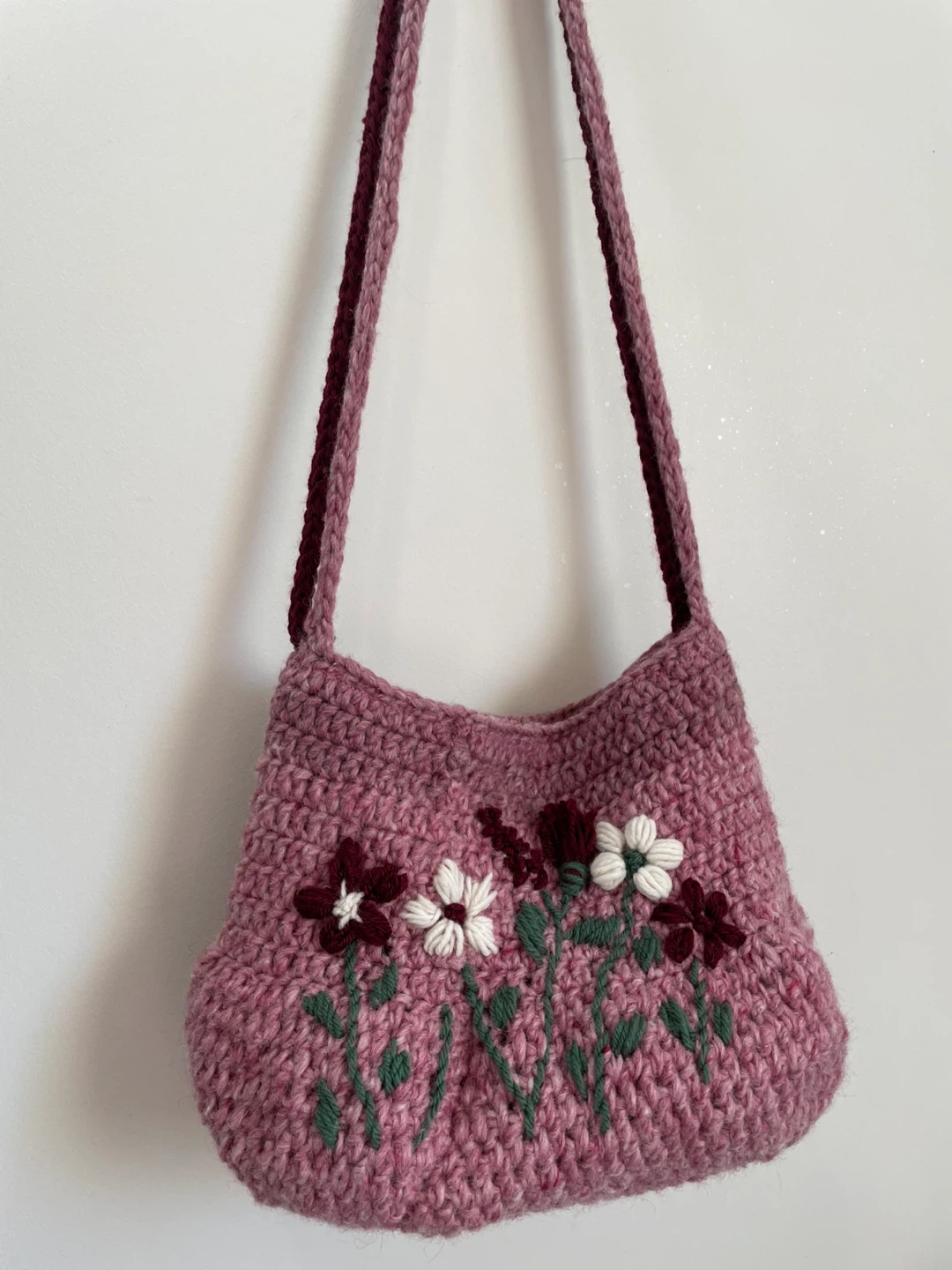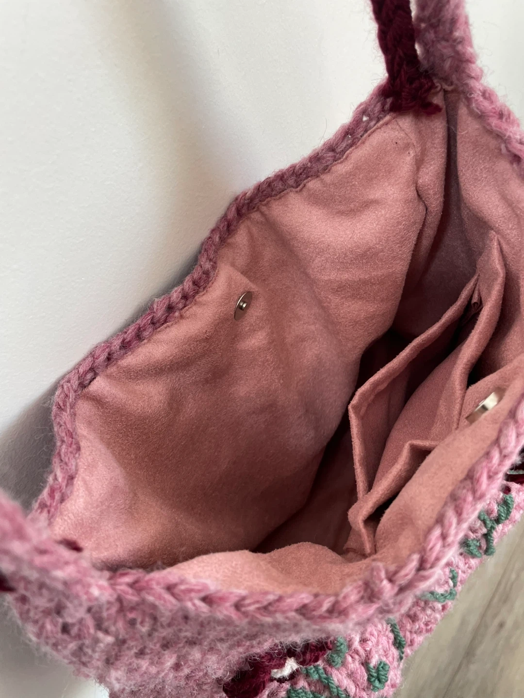This charming handmade bag is crocheted in a lovely pink yarn with embroidered flowers. It features a soft pink lining with interior pockets and a secure snap closure. It's a unique accessory for carrying your essentials!