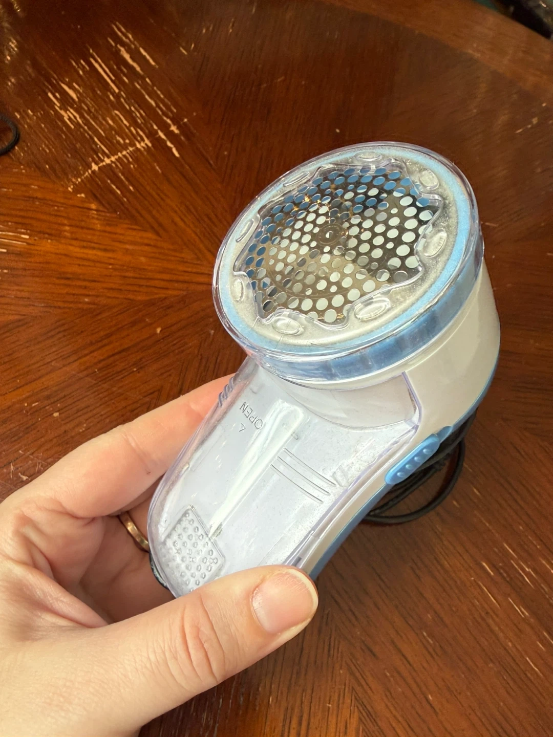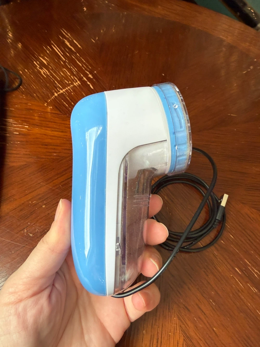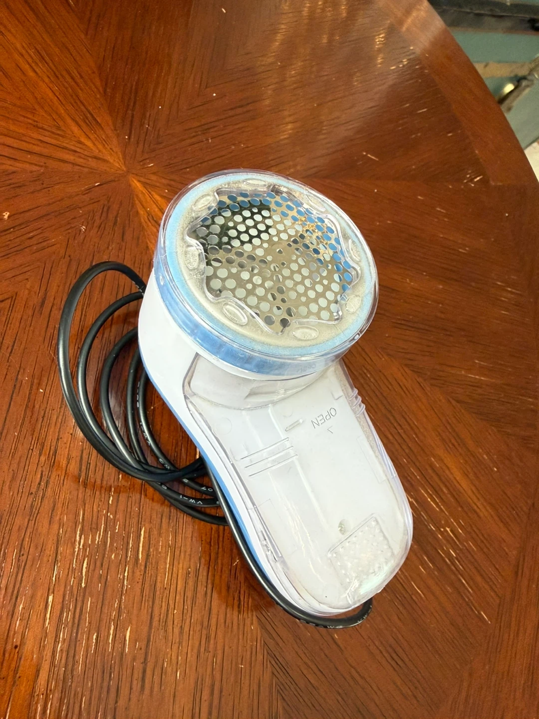 Blue and white plastic fabric shaver with metal blade guard and clear plastic housing for the lint collector
