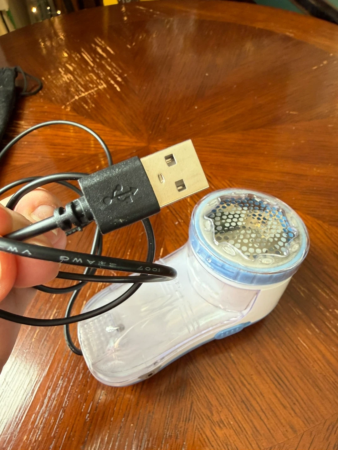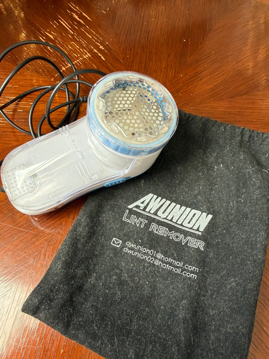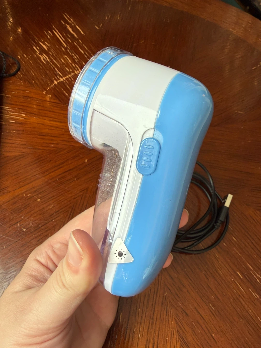 Blue and white plastic fabric shaver with metal blade guard and clear plastic housing for the lint collector