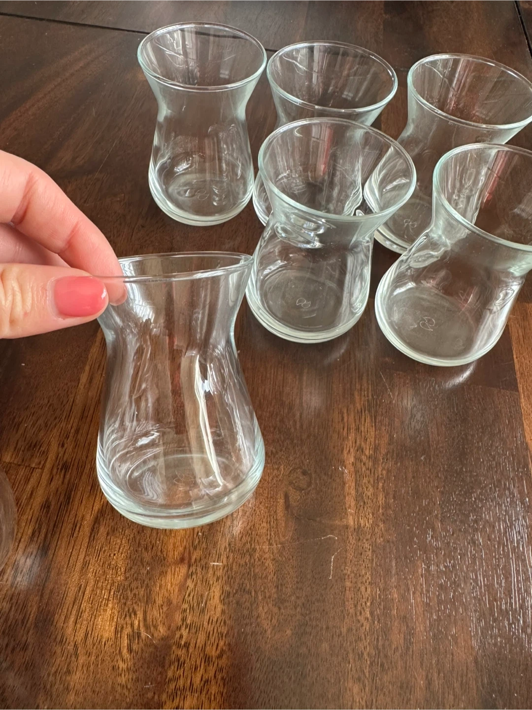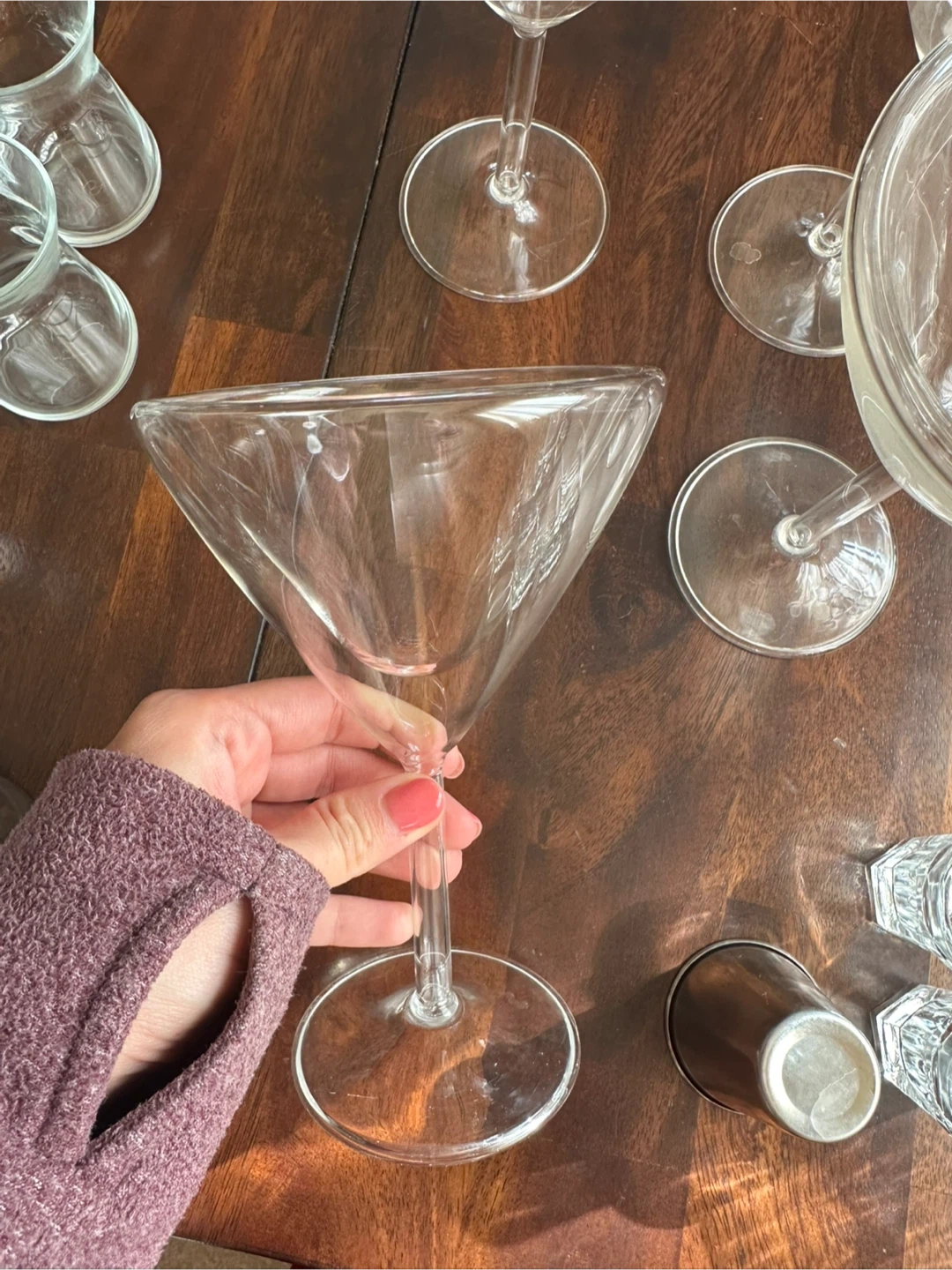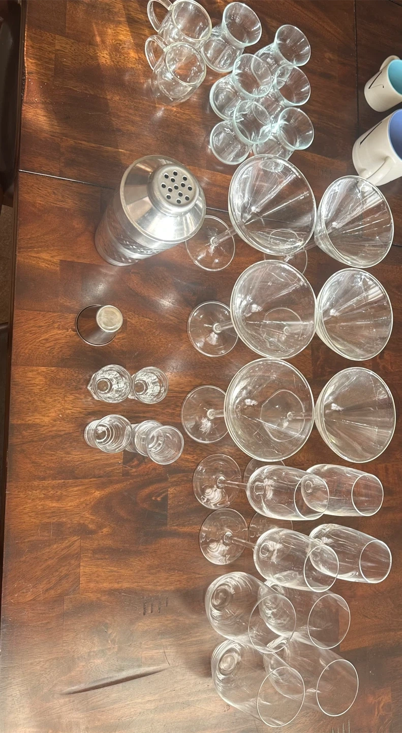 22 glasses. Collection of clear glass drinking glasses and wine glasses. Includes stemmed wine glasses, double-walled martini and small glasses. With complimentary stainless steel cocktail shaker and shots.