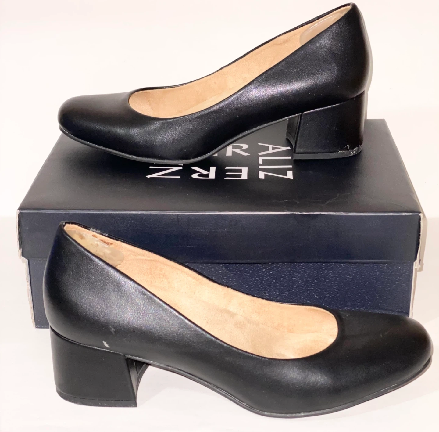 These Naturalizer pumps are crafted from black leather with a classic block heel. The inner sole shows a natural tan colour. They offer a versatile style for various occasions. They have general wear from being worn. The box has some damage and wear.