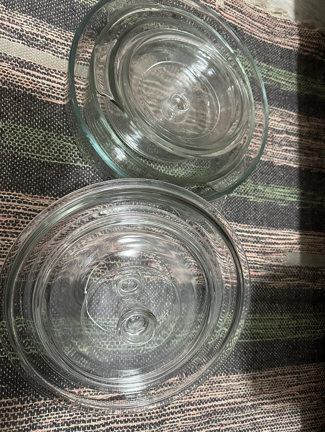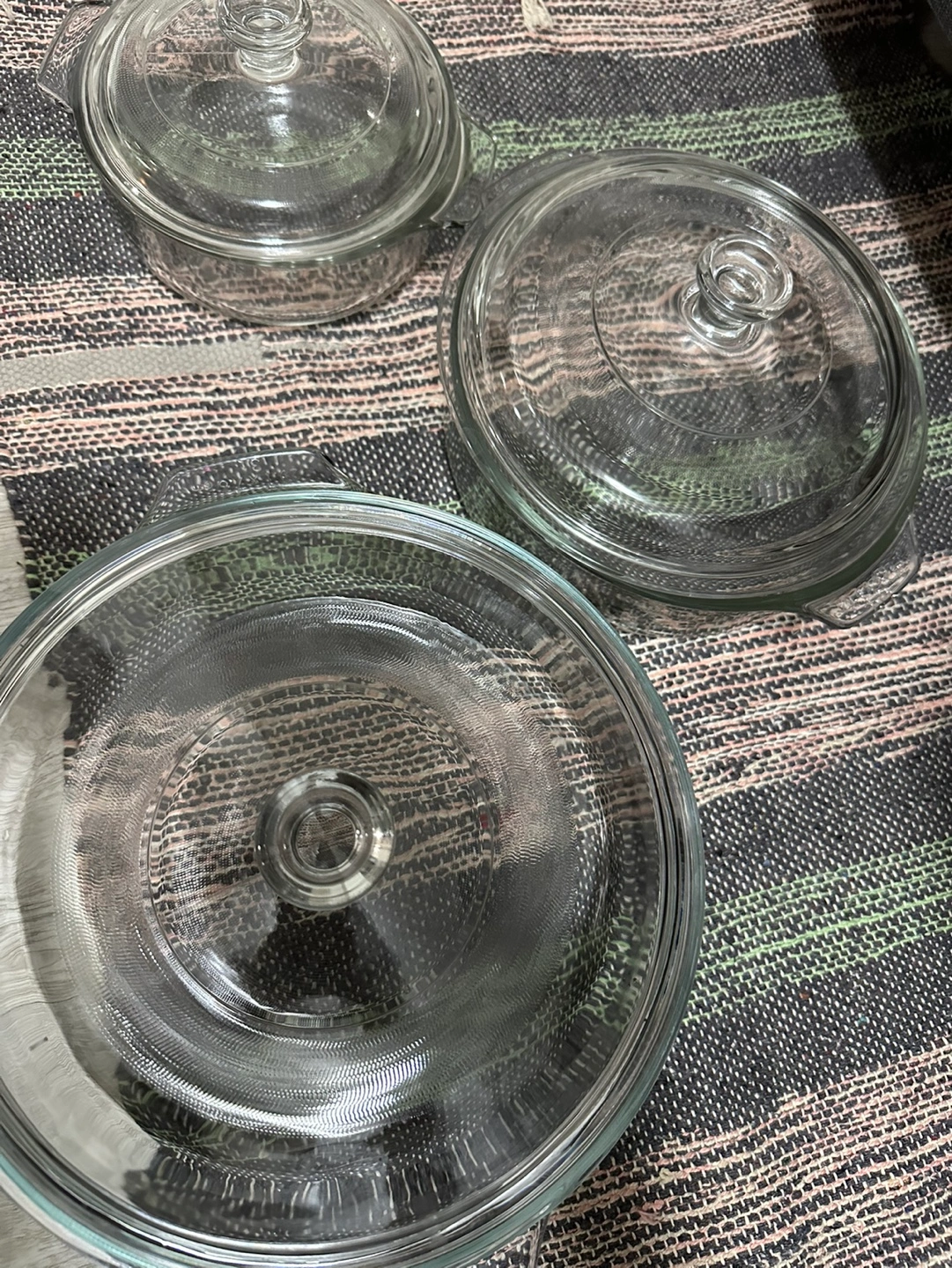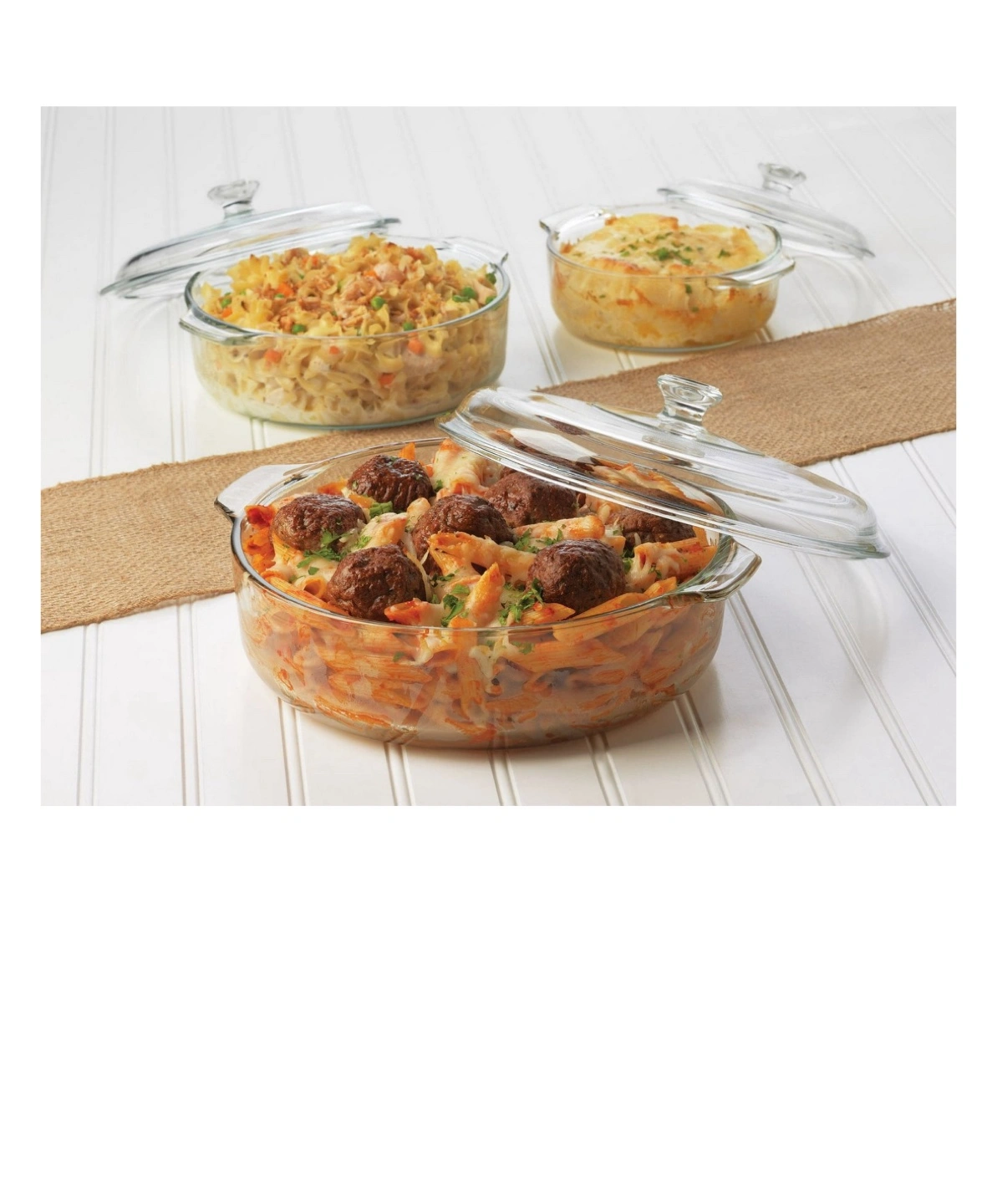 Set of 6 pieces includes 3 glass baking dishes with lids. Dishwasher, freezer, microwave and oven safe.