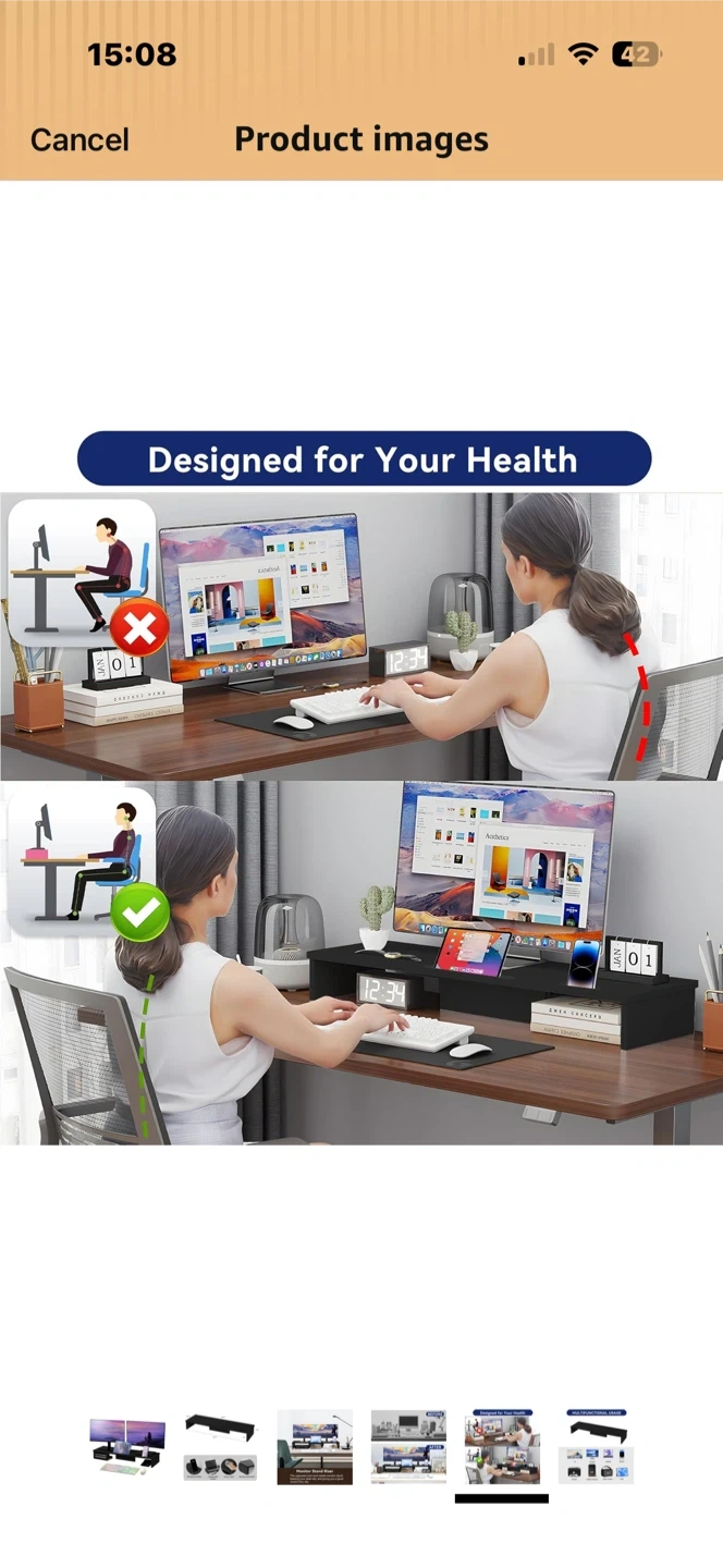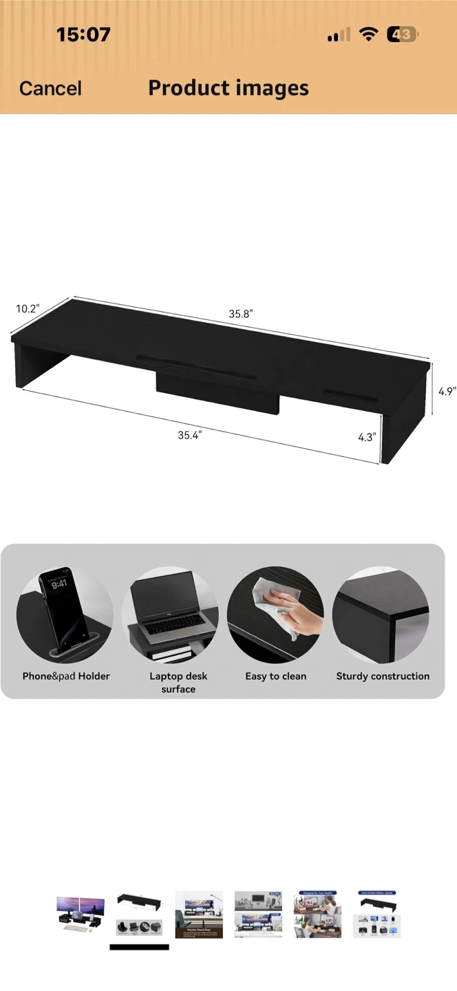 This black monitor stand riser measures 35.8 inches long, 10.2 inches deep, and 4.9 inches high. It offers a phone/pad holder slot and a laptop desk surface. It's easy to clean and has a sturdy construction.