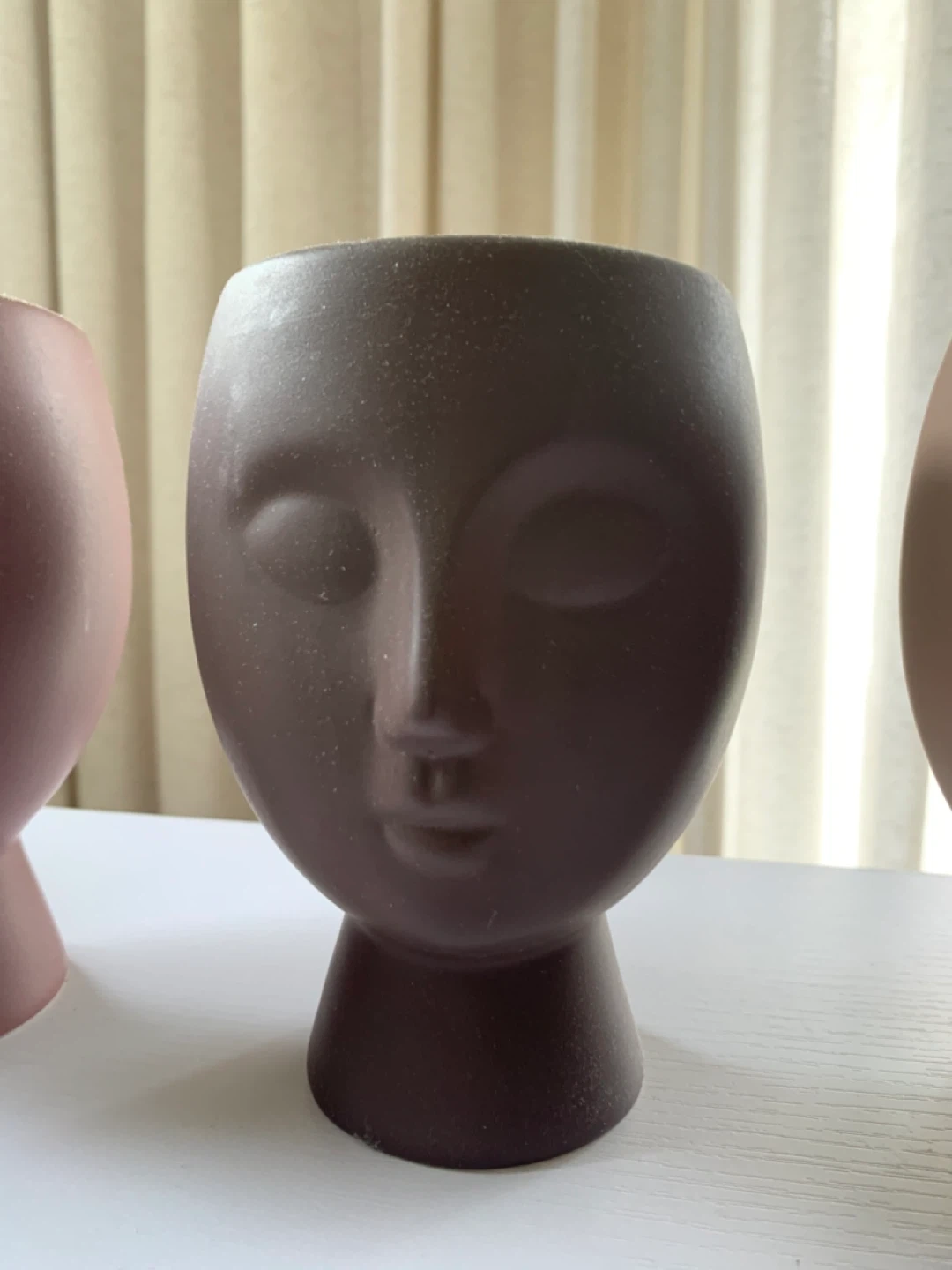 Set of three decorative planters shaped like human faces. Made from ceramic material in dusty rose, dark brown, and beige colours. These unique pots add a touch of artistic flair to any space. Suitable for small plants or as desk decor.