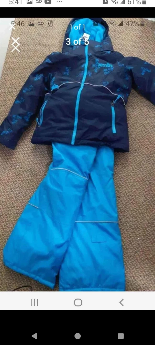 Selling a kids' ski snowsuit set brand new with tags on.The set includes a jacket with a hood and matching snow pants. The jacket is navy blue with a blue floral pattern and light blue zipper. The pants are a bright blue colour. Perfect for keeping your little one warm and dry during winter activities!