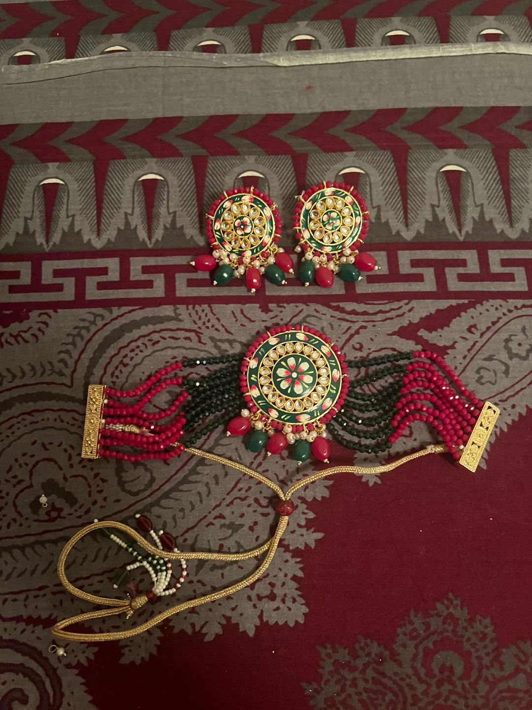 A beautiful Indian jewellery set featuring a choker necklace and matching earrings. It's adorned with green and pink stones and intricate gold-toned detailing. This set is perfect for special occasions and cultural events!