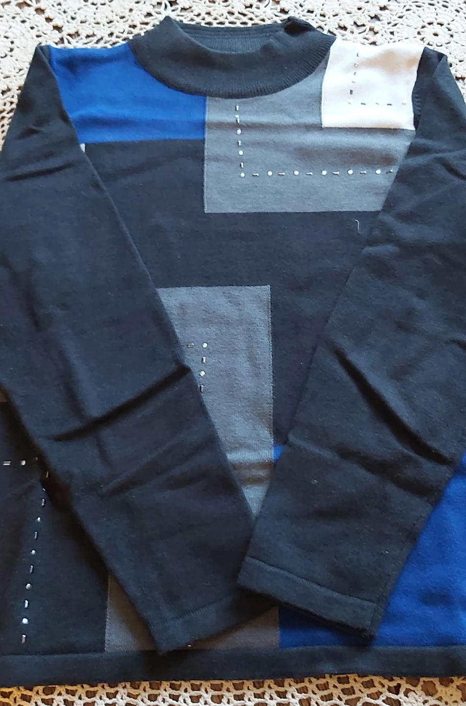 Alia Petite sweater with a geometric pattern featuring black, grey, blue, and white blocks. It's made from a cotton and acrylic blend. This petite sweater is a size PS. It's great for adding a stylish touch to your outfit!