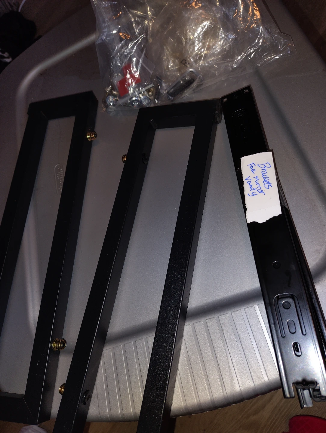 This is a used vanity in great condition, but it has a few issues. It's currently lopsided because the legs were removed and not reattached. You'll need to put the legs back on before moving it, as it's too heavy to handle alone. Additionally, one of the top drawers is missing its slide brackets, so you'll need to install those as well. The price is firm, so please don't try to negotiate. You'll need to bring help to move it, as it's very heavy.