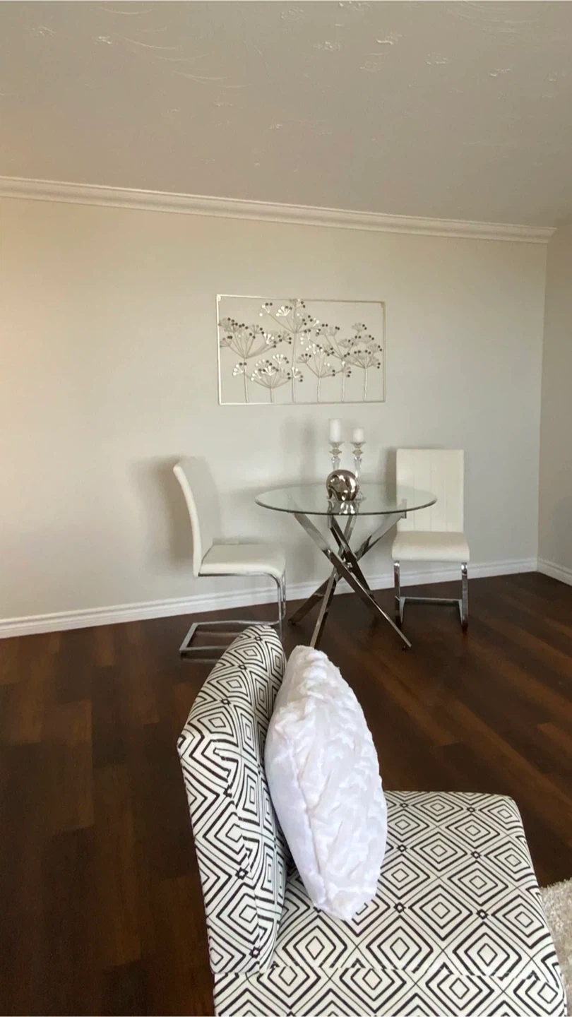 This dining set features a modern glass-top table with a sleek chrome base. It comes with two stylish white faux leather chairs with chrome legs. Table dimensions are 44" L x 44" D x 30" H. It's a compact set suitable for smaller dining areas.