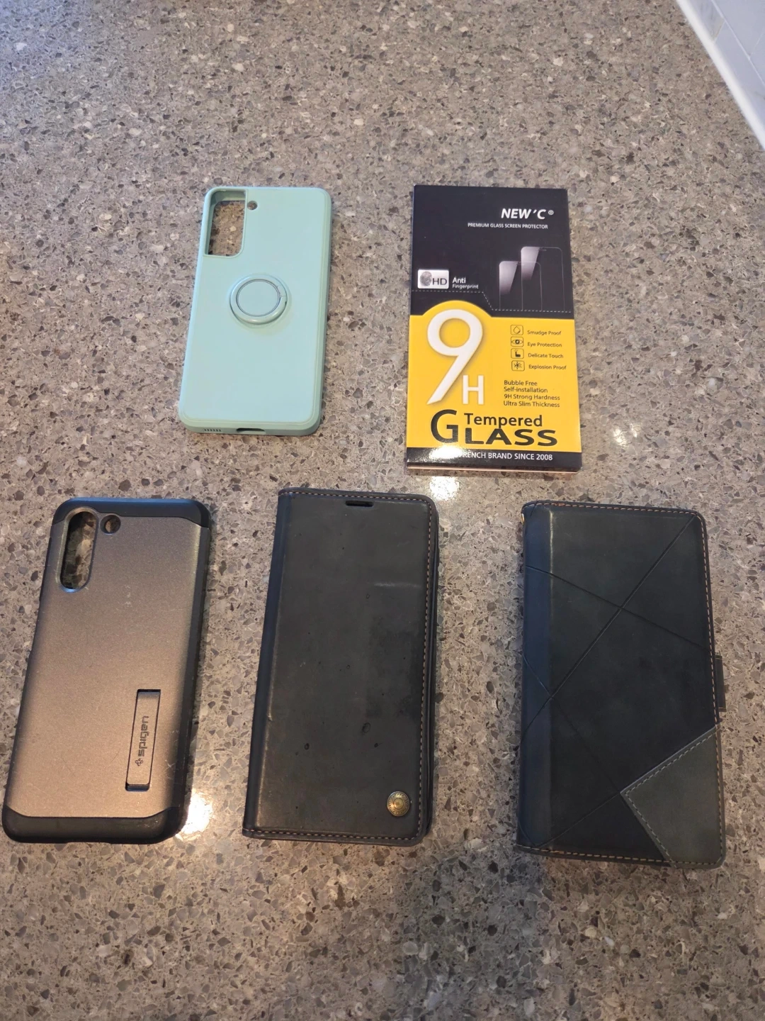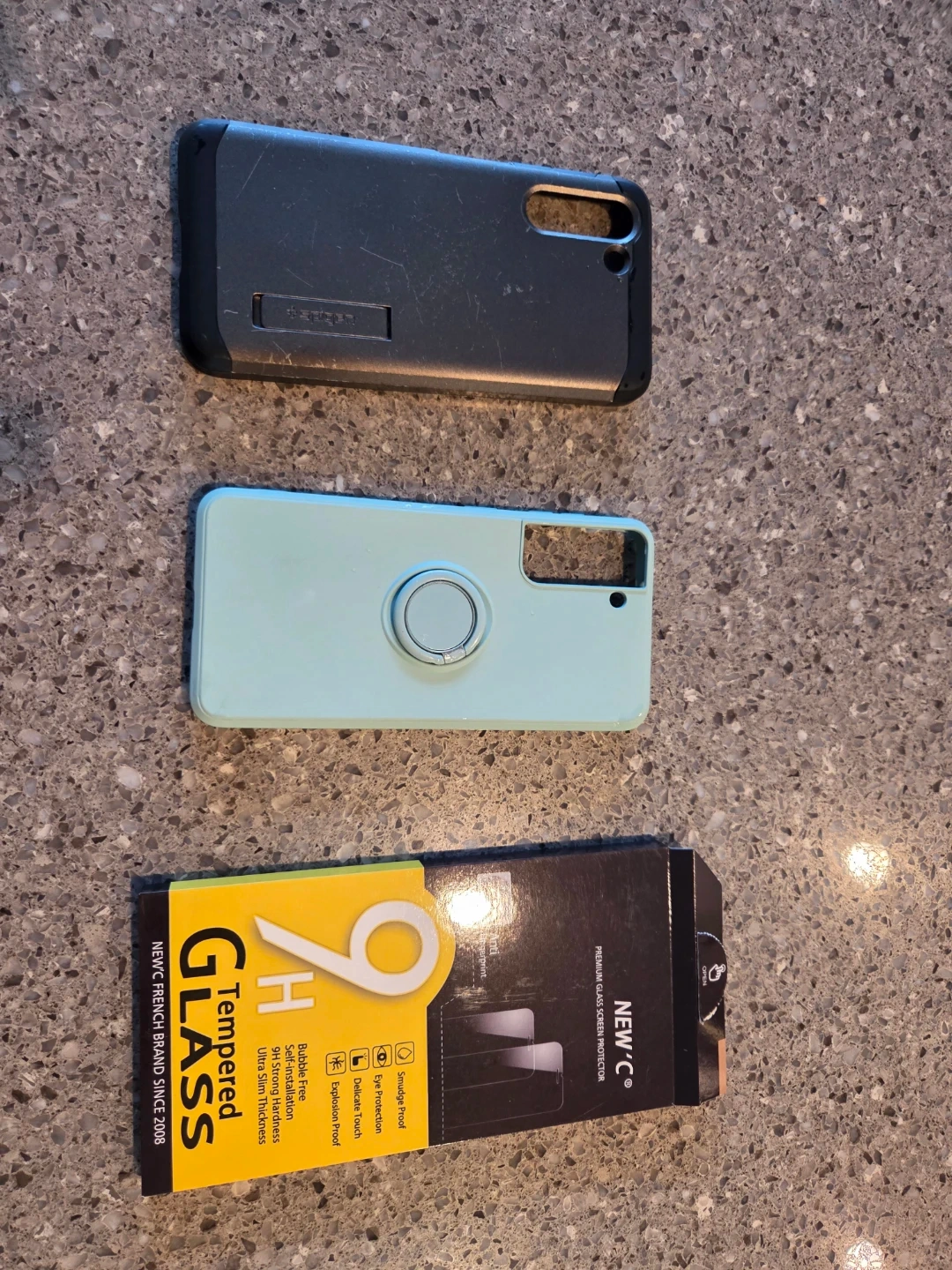 This is a NEW 'C' brand tempered glass screen protector for a Samsung Galaxy S21 5G (6.2"). It's made in China and includes the necessary installation tools. Also included are phone cases: one mint green with a pop socket and one black Spigen case.