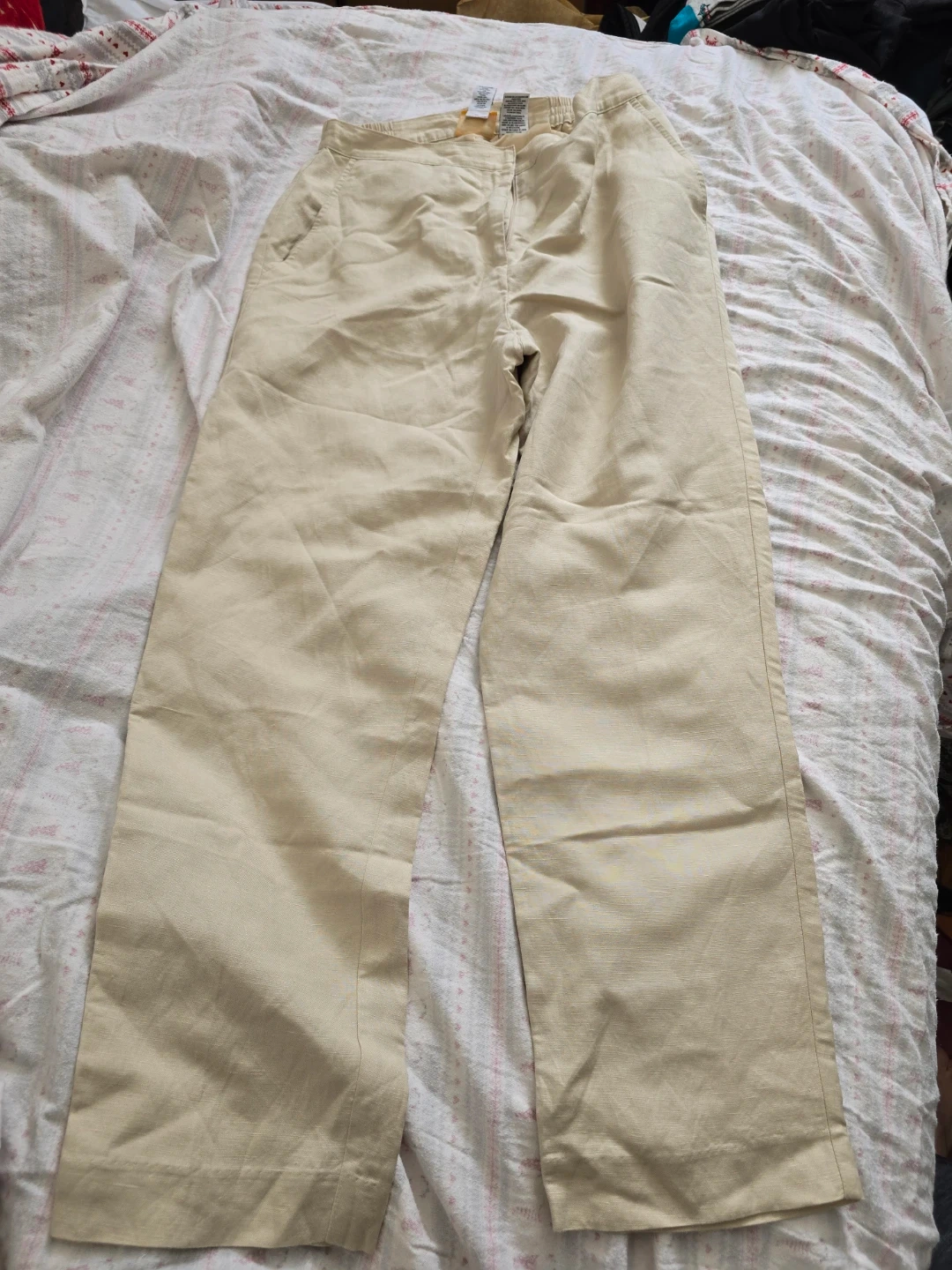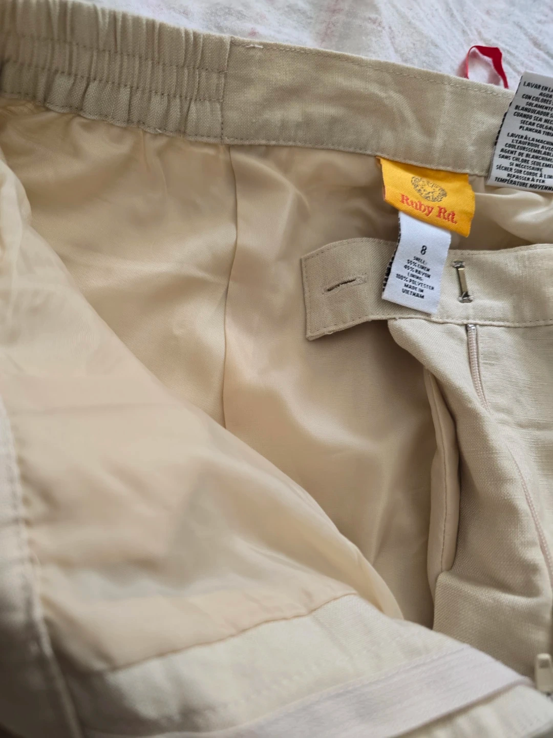 These Ruby Rd. pants are a size 8 and made from a linen blend. They feature an elastic waistband .It lined for ease of wear and the material . Pics taken under natural light.