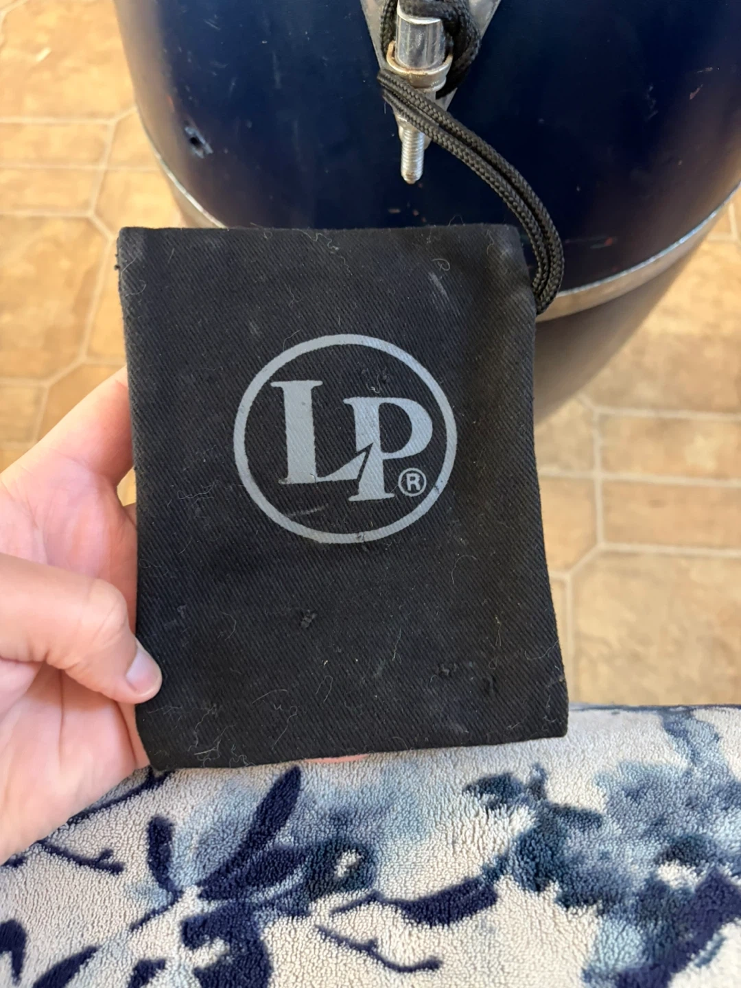 This is an LP conga drum. It's dark blue with a natural rawhide head. Comes with a small black drawstring pouch. Used by Latin Percussion, Inc.
