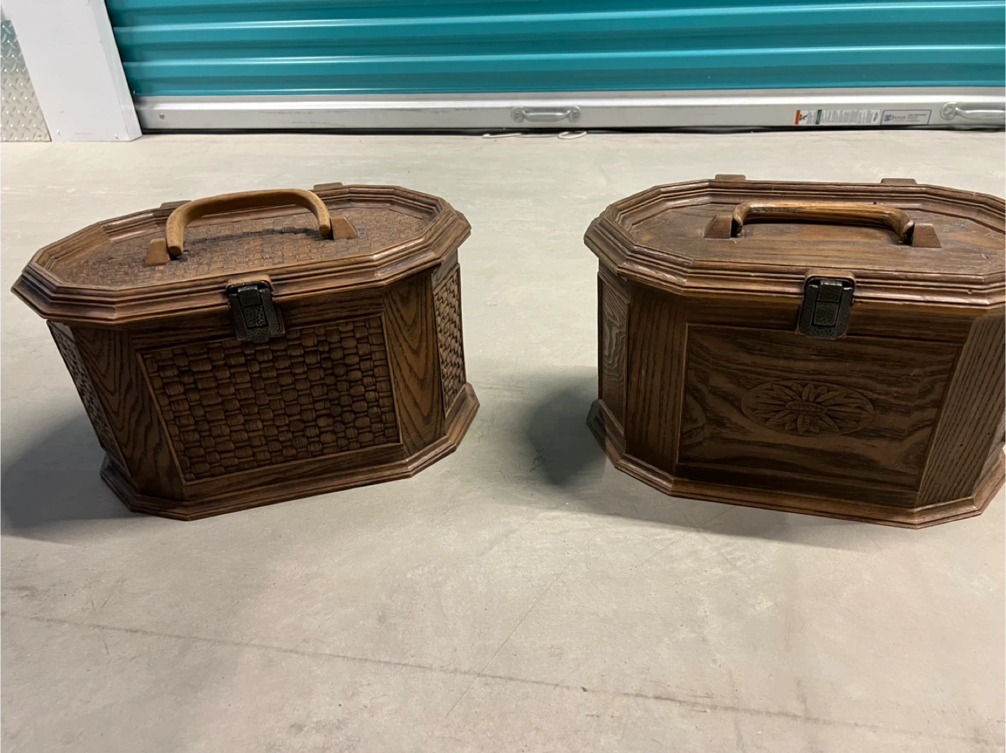 Beautiful pair of authentic 1970s Lerner Manufacturing (Melville, N.Y.) octagonal sewing/craft boxes. These are in excellent vintage condition and complete with the hard-to-find original interiors.