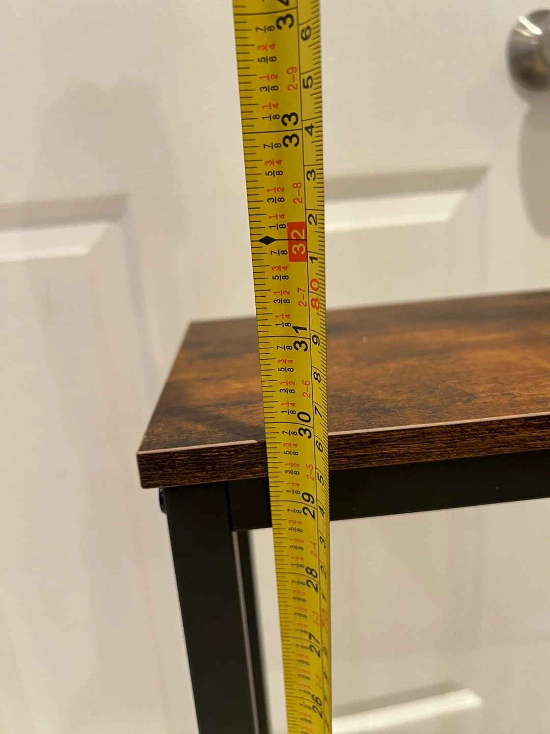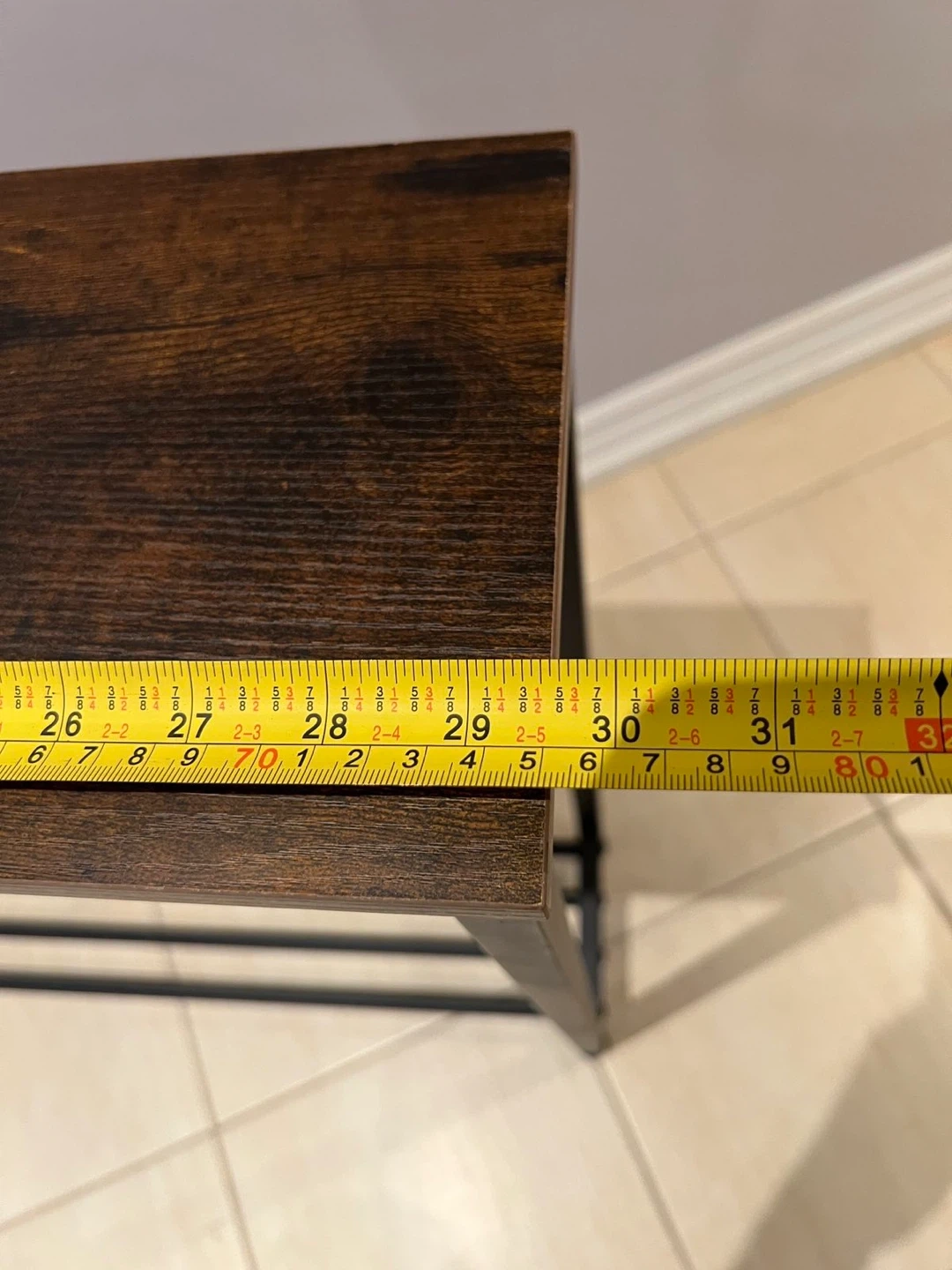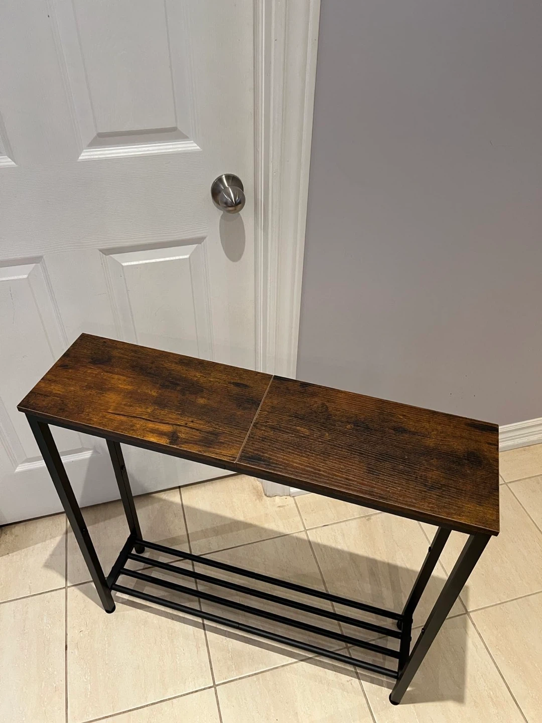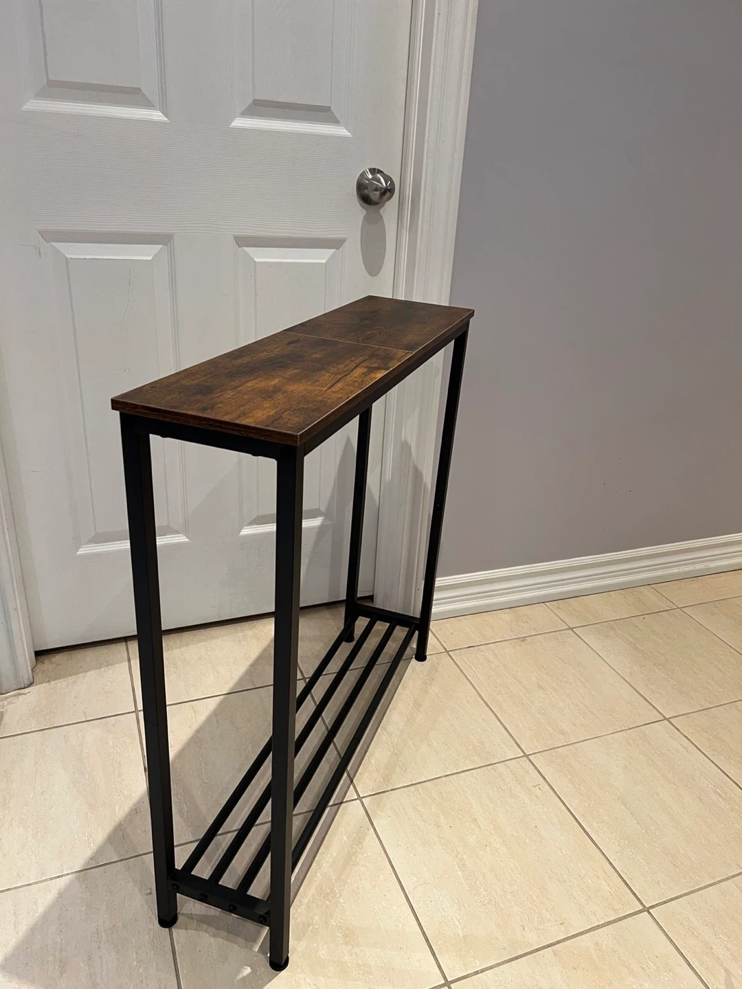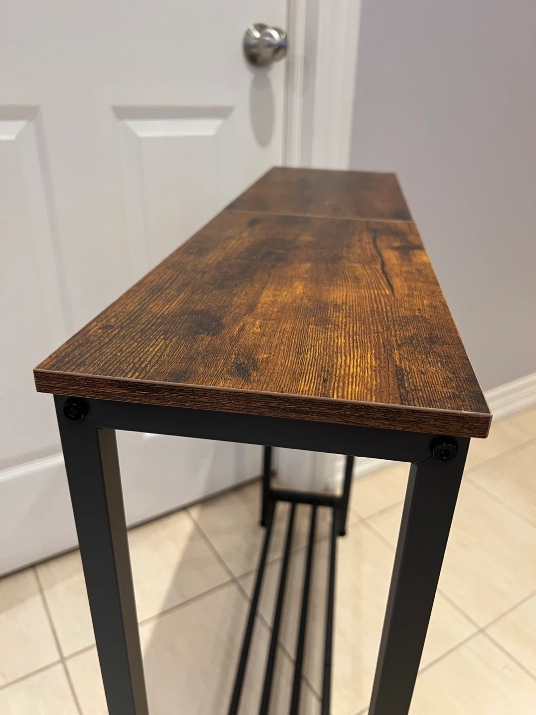 This is a narrow console table with a rustic wood-look top and black metal frame. It has a lower shelf for additional storage. It's a great accent piece for an entryway or hallway!