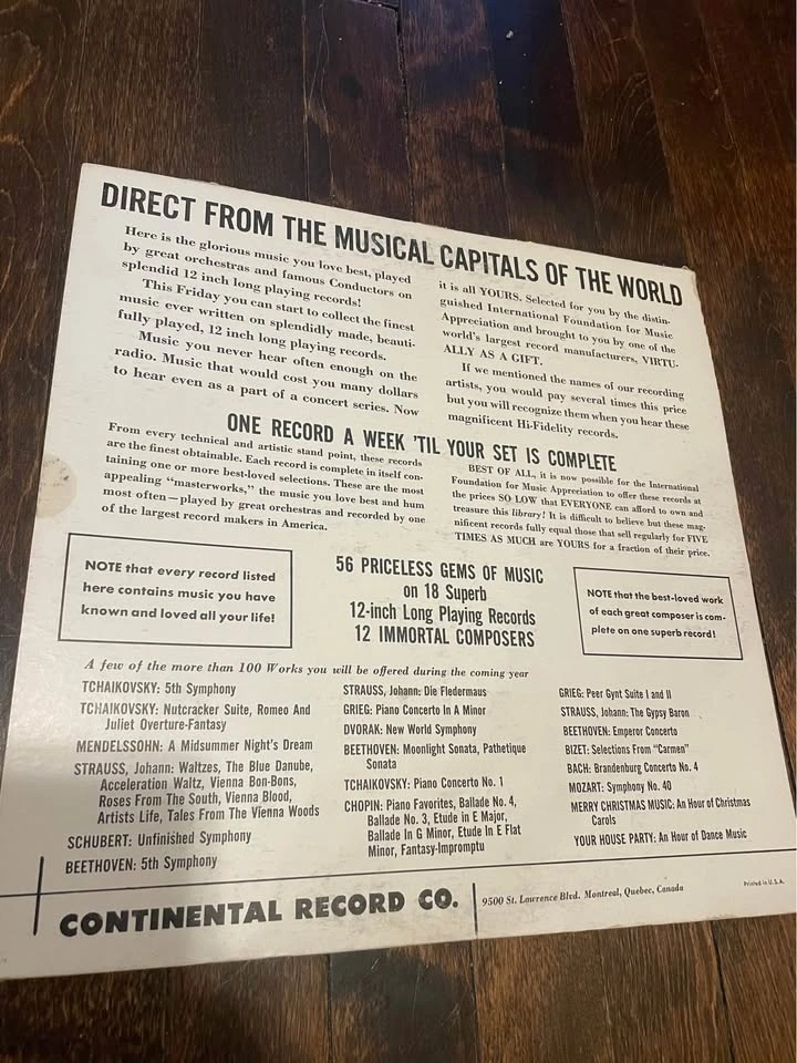Issued by Continental Record Co. – Library of Great Composers series. Classic mid-century orchestral pressing.