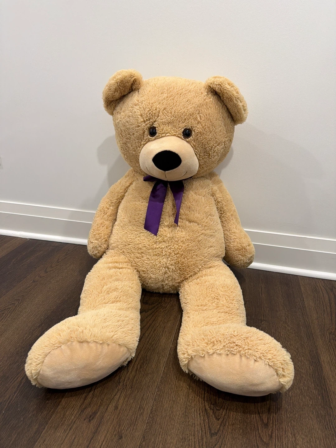 This is a large, light brown teddy bear. It's soft and plush, adorned with a purple ribbon bow around its neck. It's a cuddly companion that brings a touch of warmth. Standing around 3.5 ft